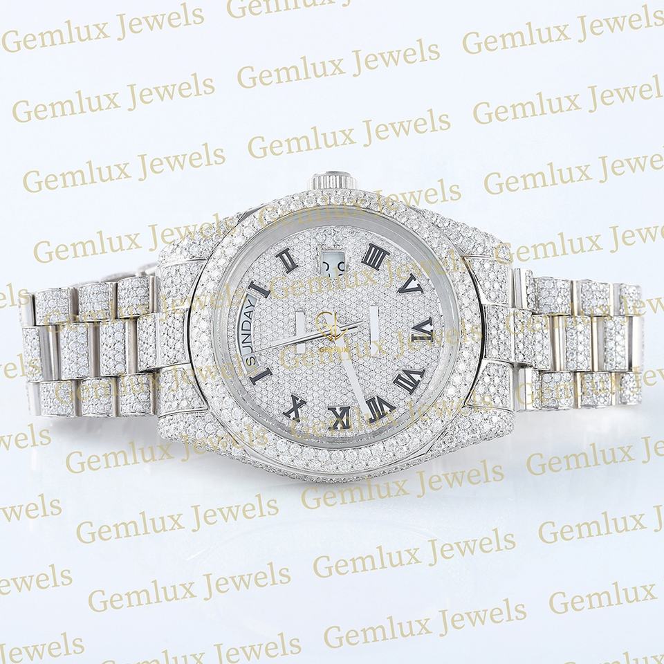 Diseño de moda Dial romano blanco completo Totalmente helado D VVS Moissanite Diamond Pass Diamond Tester Reloj de diamante de acero inoxidable