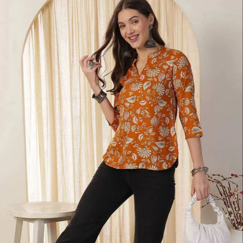 Top de Rayón con Estampado Digital de Moda para Jeans