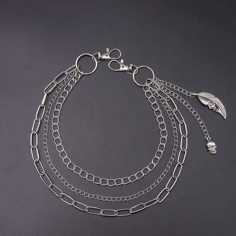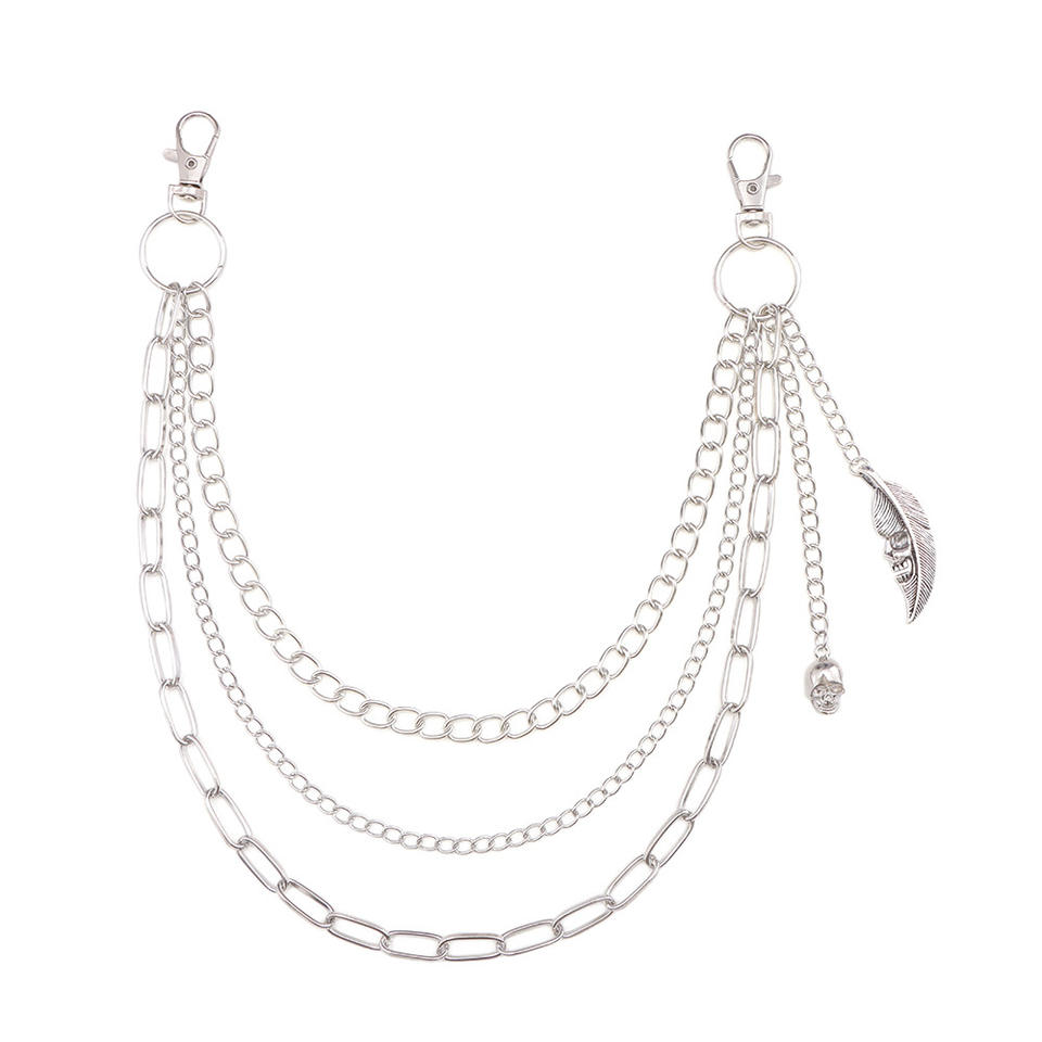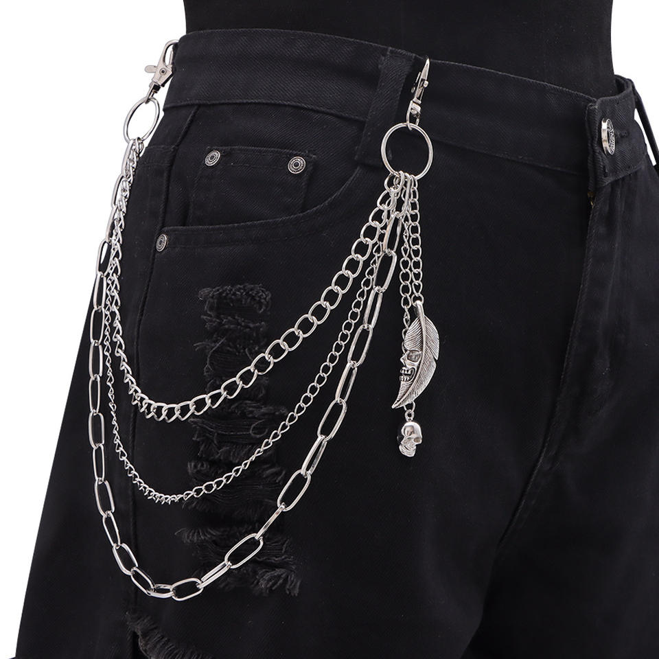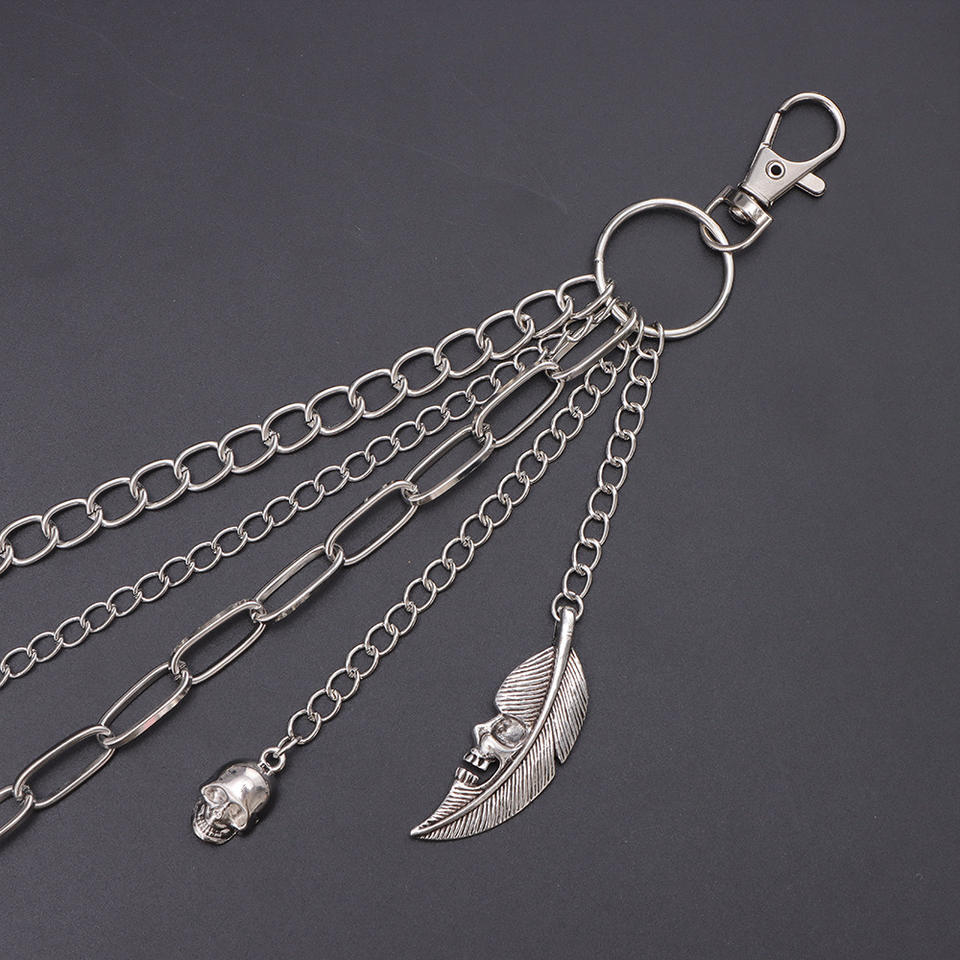 Cadena de pantalón de metal multicapa de moda con colgante de calavera y plumas, estilo punk, para uso casual