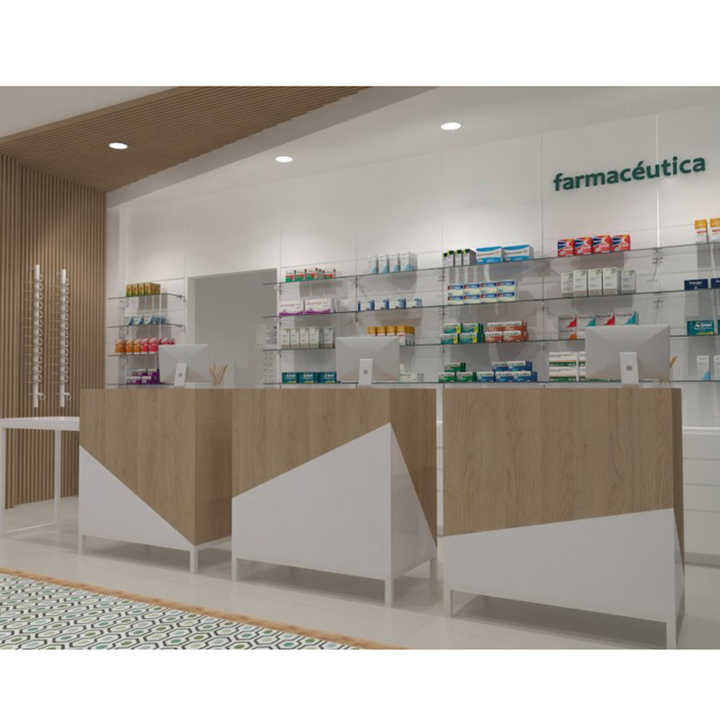 Mostrador de Recepción de Tienda Médica de Estilo Simple y Moderno, Diseño Personalizado de Madera, Mostrador de Farmacia con Base para Piso