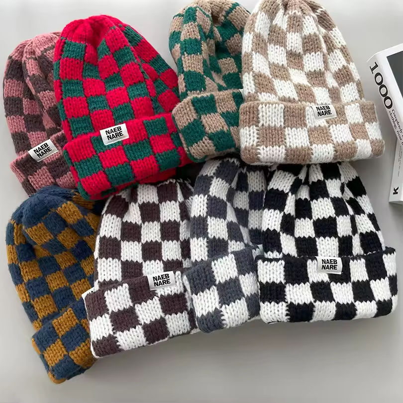Gorro de Invierno Moderno y Colorido, Grueso, Acrílico, Cálido, Tejido, a Cuadros, con Relieve, Unisex, con Logotipo Personalizado para Adultos