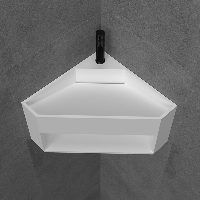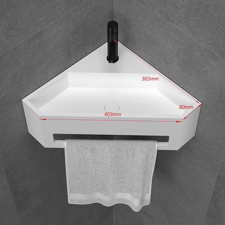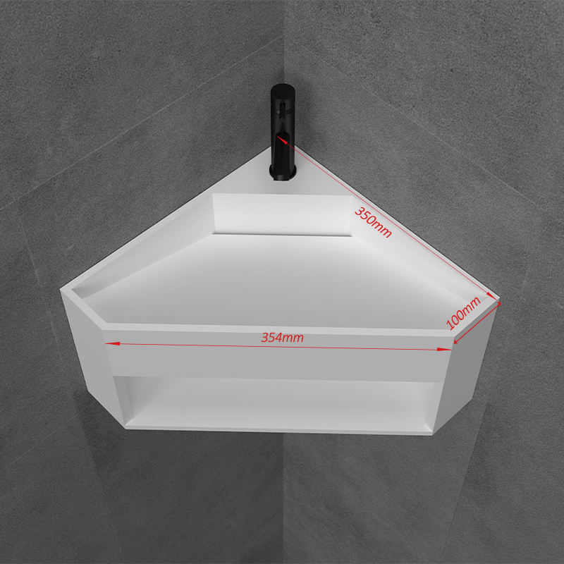 Fregadero de esquina triangular de superficie sólida, lavabo de pared de tamaño pequeño para Baño