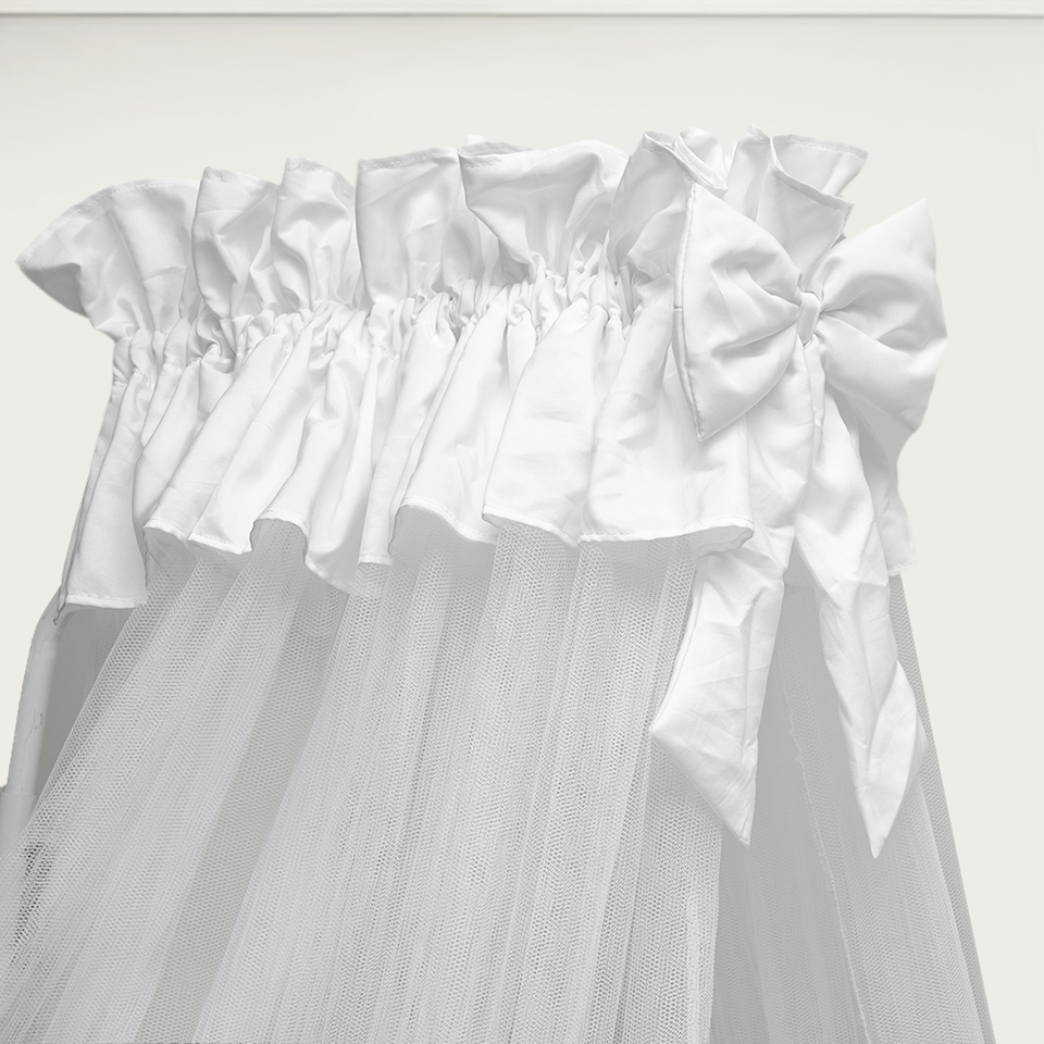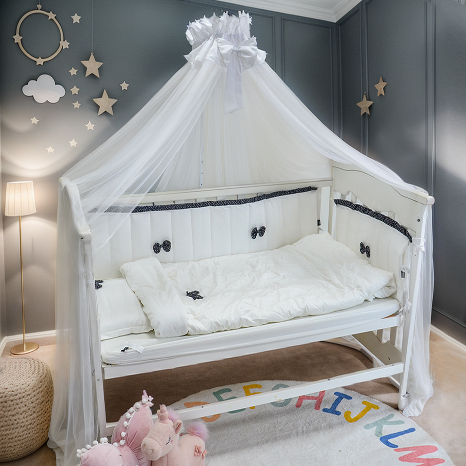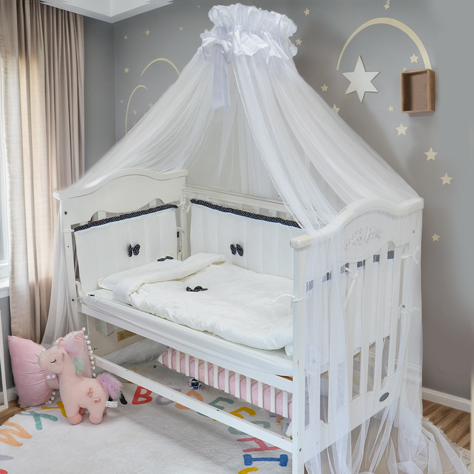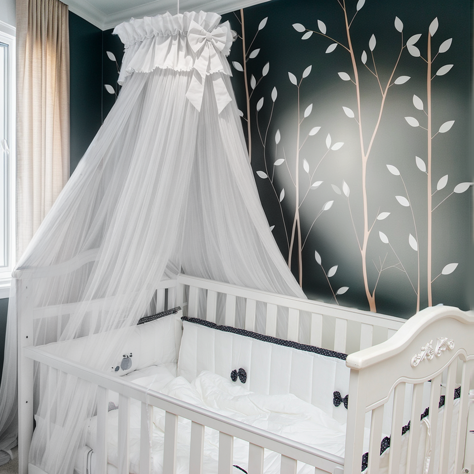 Diseño de anillo superior triangular Redes de bebé con lazo blanco para cuna con soportes de metal