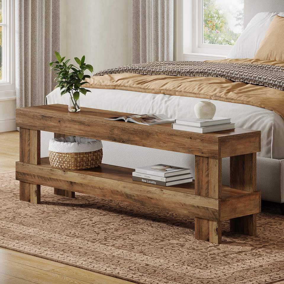 Tribesigns Banco de pie de cama estilo rústico de 59 pulgadas con estante de almacenamiento abierto de 2 niveles para dormitorio, entrada, pasillo, sala de estar, marrón rústico