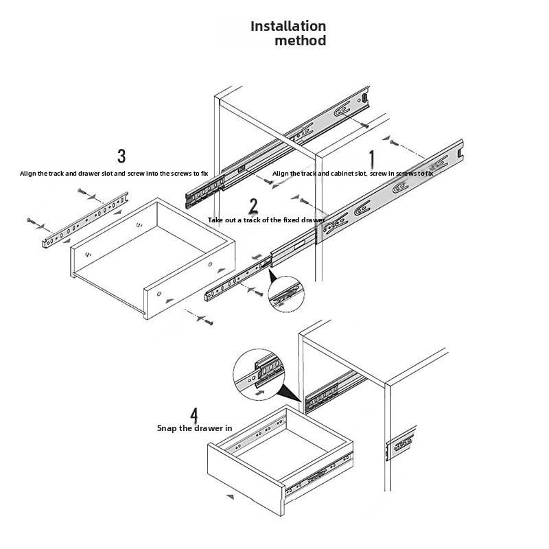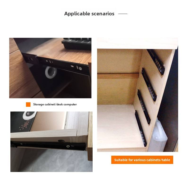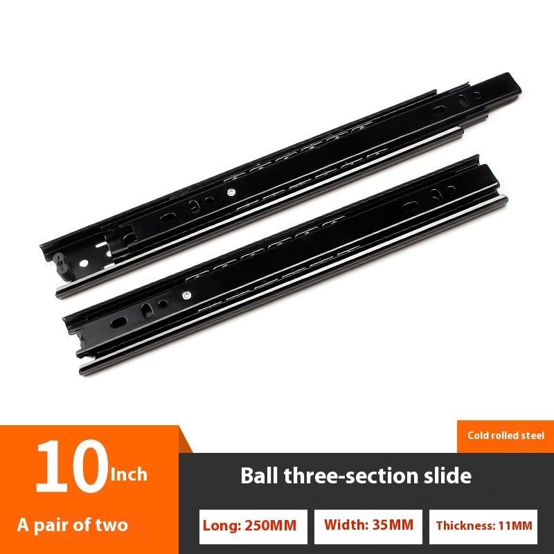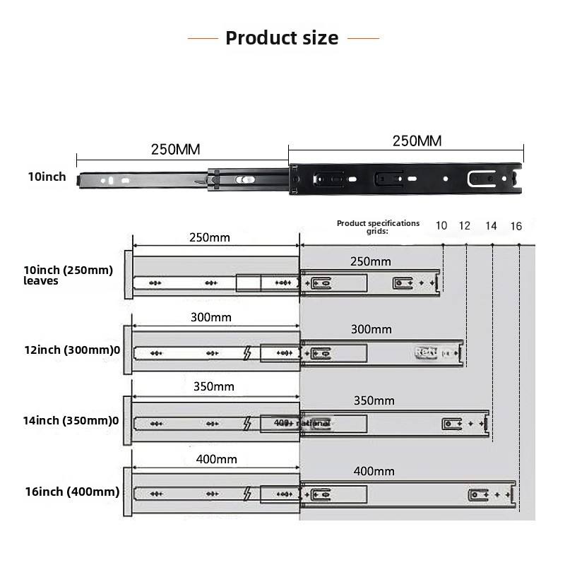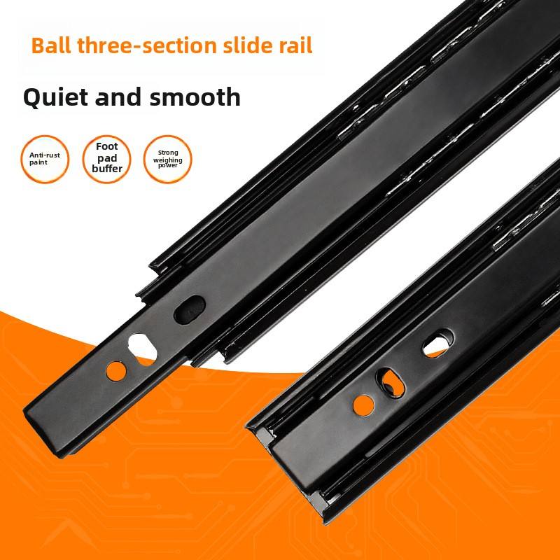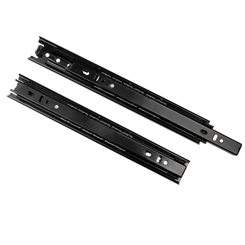 Rieles deslizantes telescópicos de acero laminado en frío de triple extensión para cajones de cocina y comedor, con rodamientos de bolas extraíbles y cierre suave.