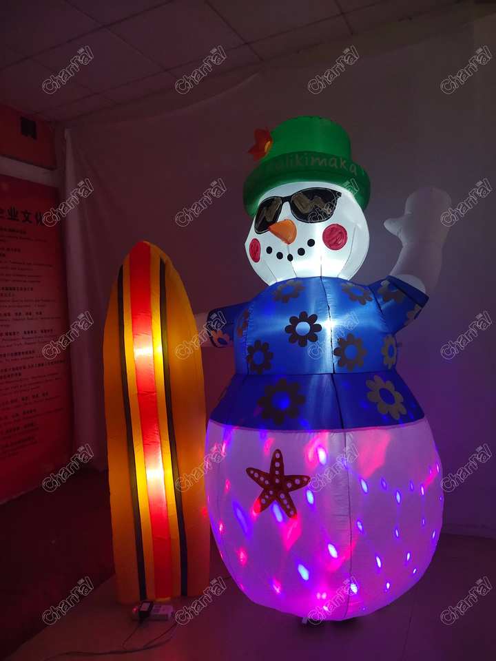 Muñeco de nieve inflable de Navidad tropical con esquís y luces de discoteca, decoración de fiesta temática Hawaiana para diversión de vacaciones al aire libre