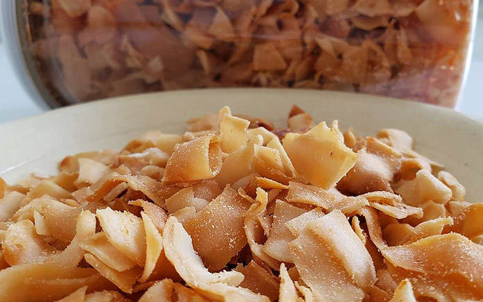 Chips de coco secos crujientes tropicales Bocadillo saludable crujiente hecho de 100 por ciento de Coco para amantes de la dieta y veganos de fitness