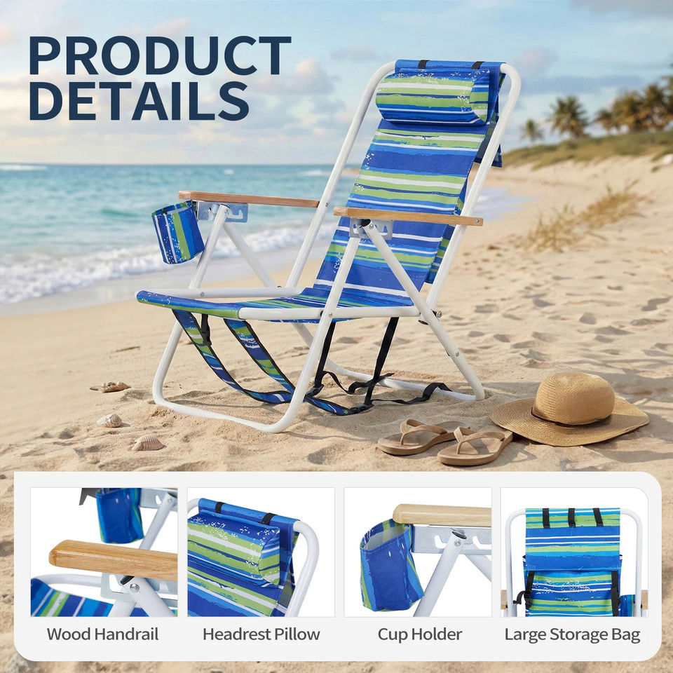 Silla de Playa Plegable Portátil de 4 Niveles Ajustables para Exteriores, con Portavasos y Reposacabezas Extraíble