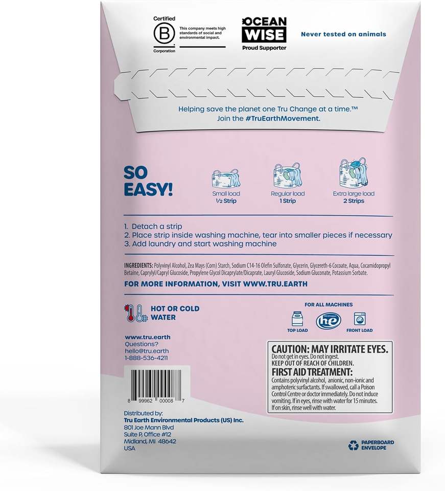Hojas/Tiras de Detergente para Ropa de Bebé Tru Earth Hipoalergénicas para Pieles Sensibles, 64 Unidades, Hasta 128 Lavados: Sin Fragancia para Bebé