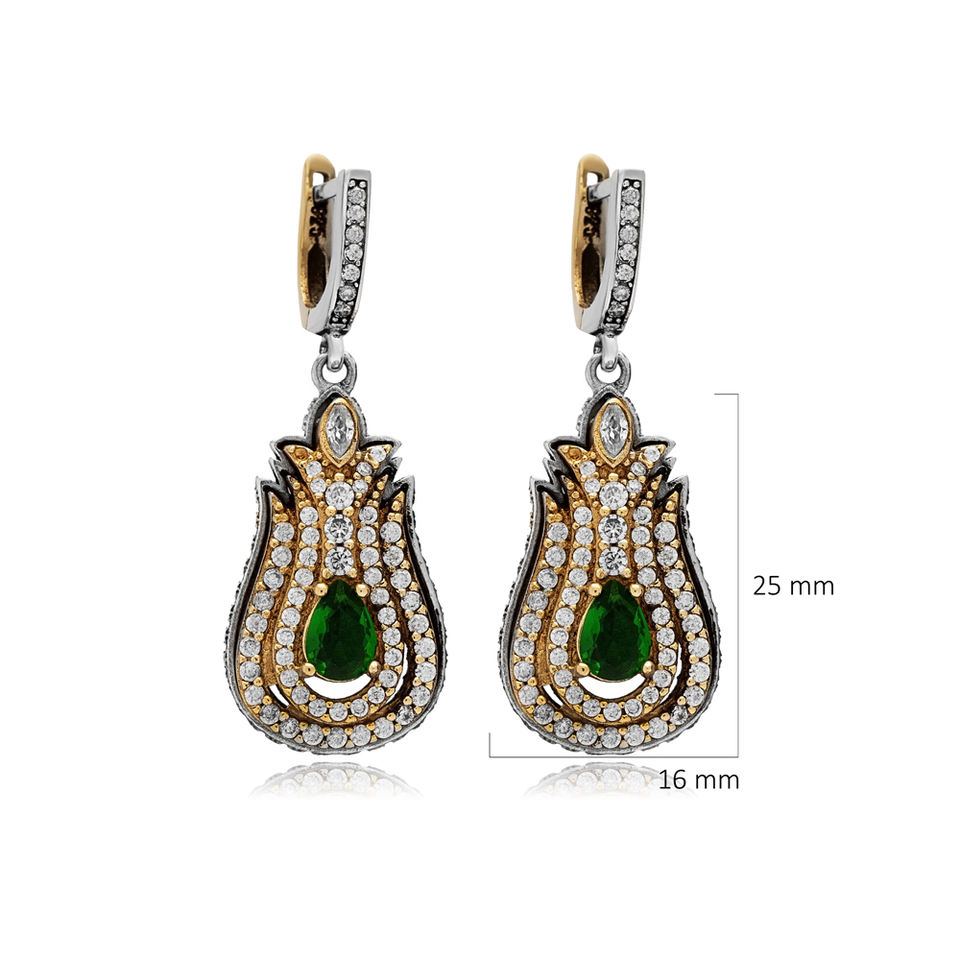 Diseño en forma de tulipán Esmeralda CZ piedra auténtico estilo otomano pendientes colgantes de plata al por mayor joyería turca hecha a mano