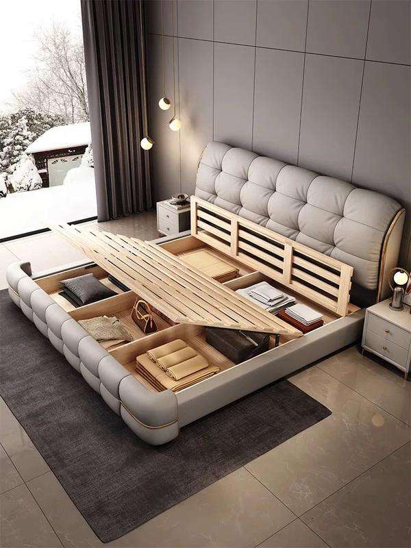 Cama Moderna Tuochen King-Size con Almacenamiento Ajustable, Elevación, Tapizada en Cuero, con Marco de Madera Convertible y Espuma Suave