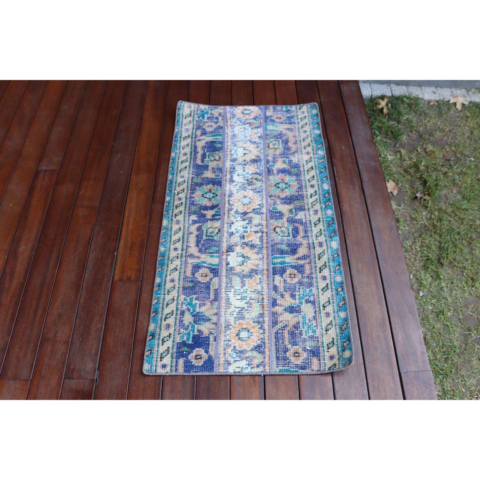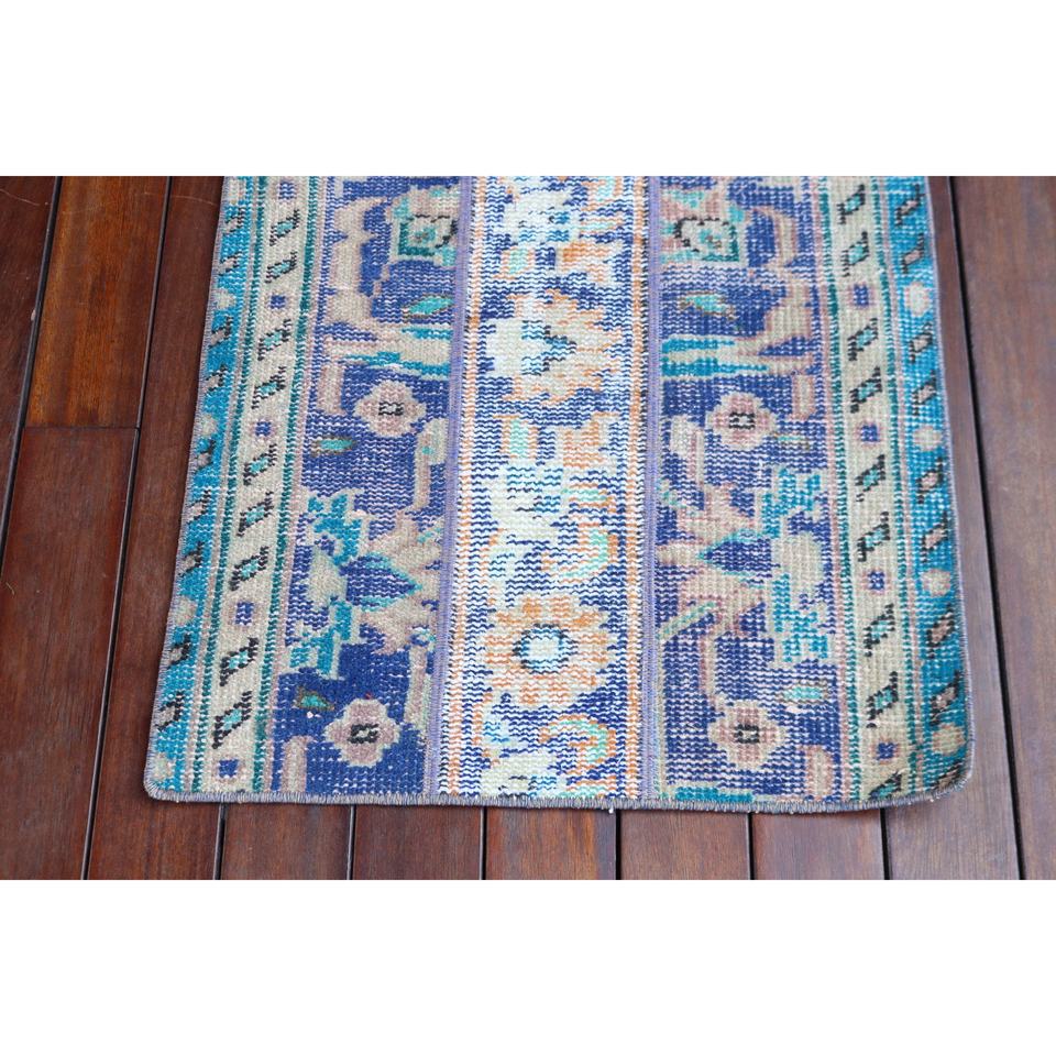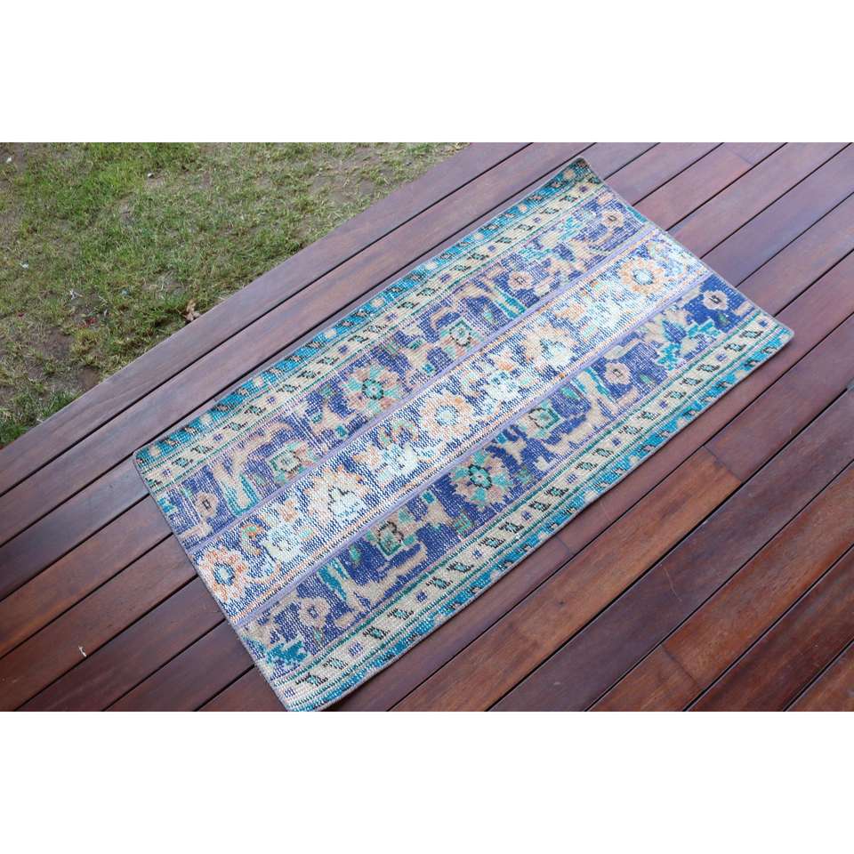Alfombra Turca de 1.9x3.6 pies, Alfombra Pequeña Vintage, Alfombra Marroquí de Lana Azul y Blanca