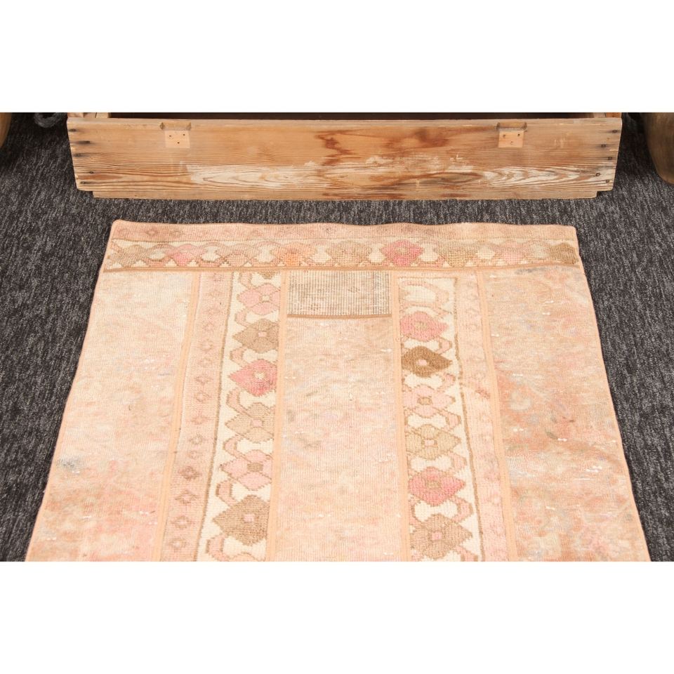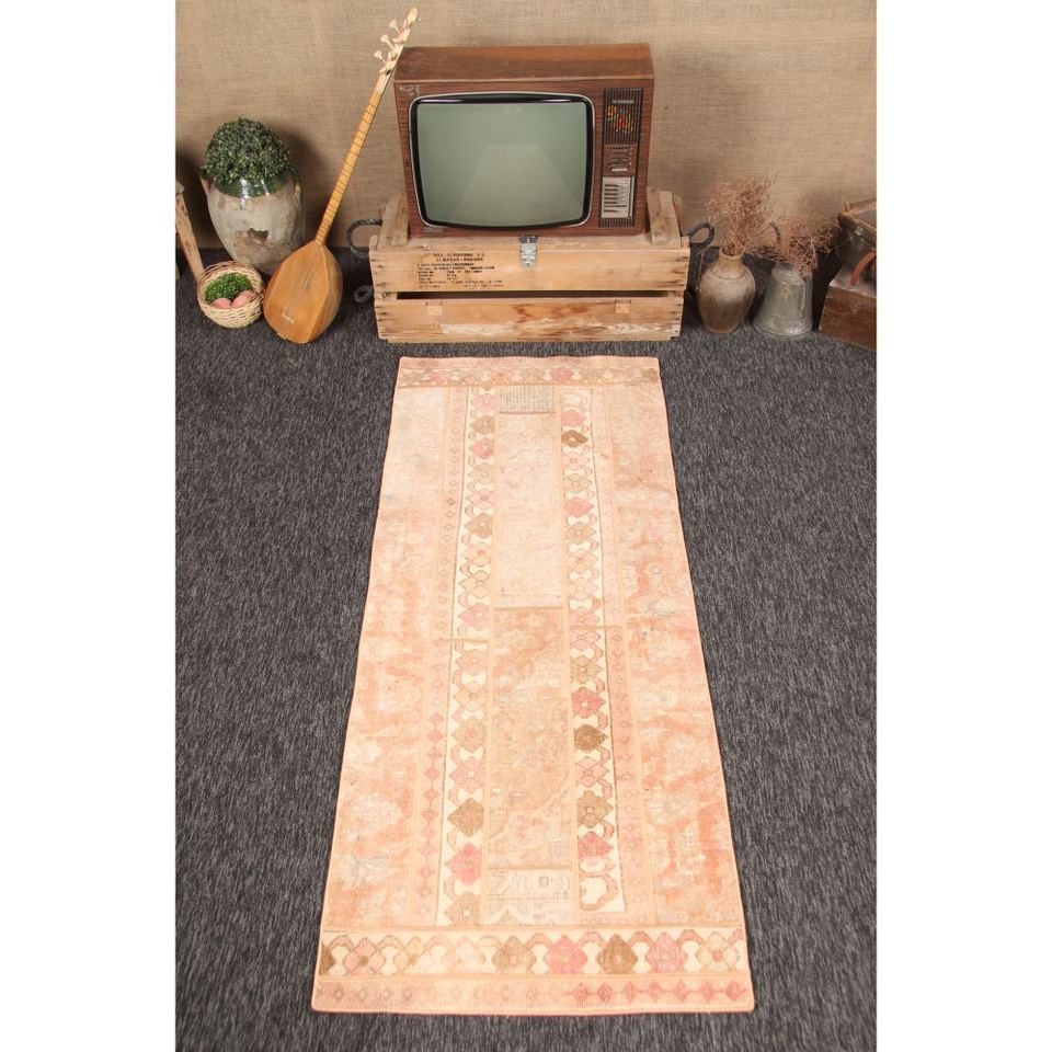 Alfombra turca de 2.7x6.6 pies, alfombra vintage de patchwork, alfombra geométrica naranja con elementos florales.