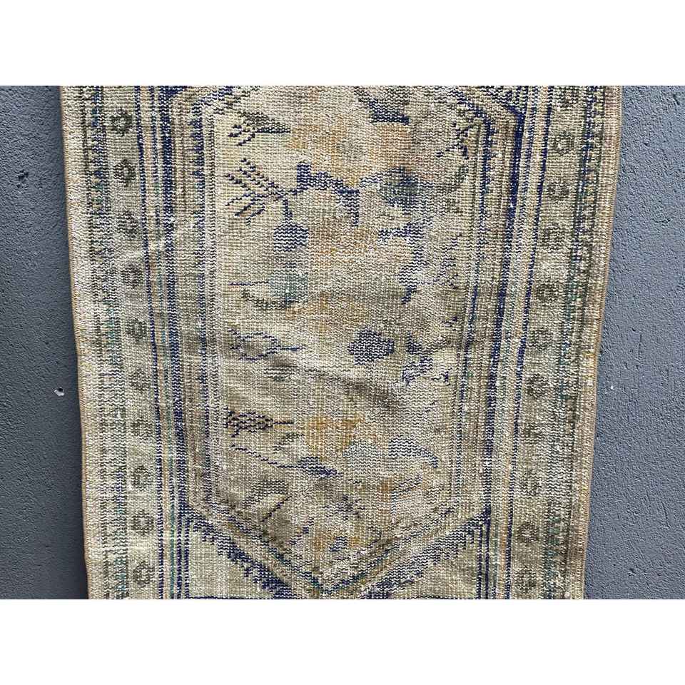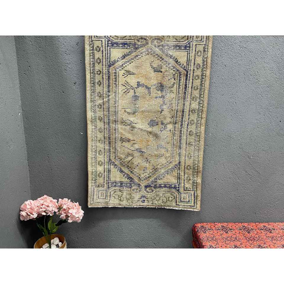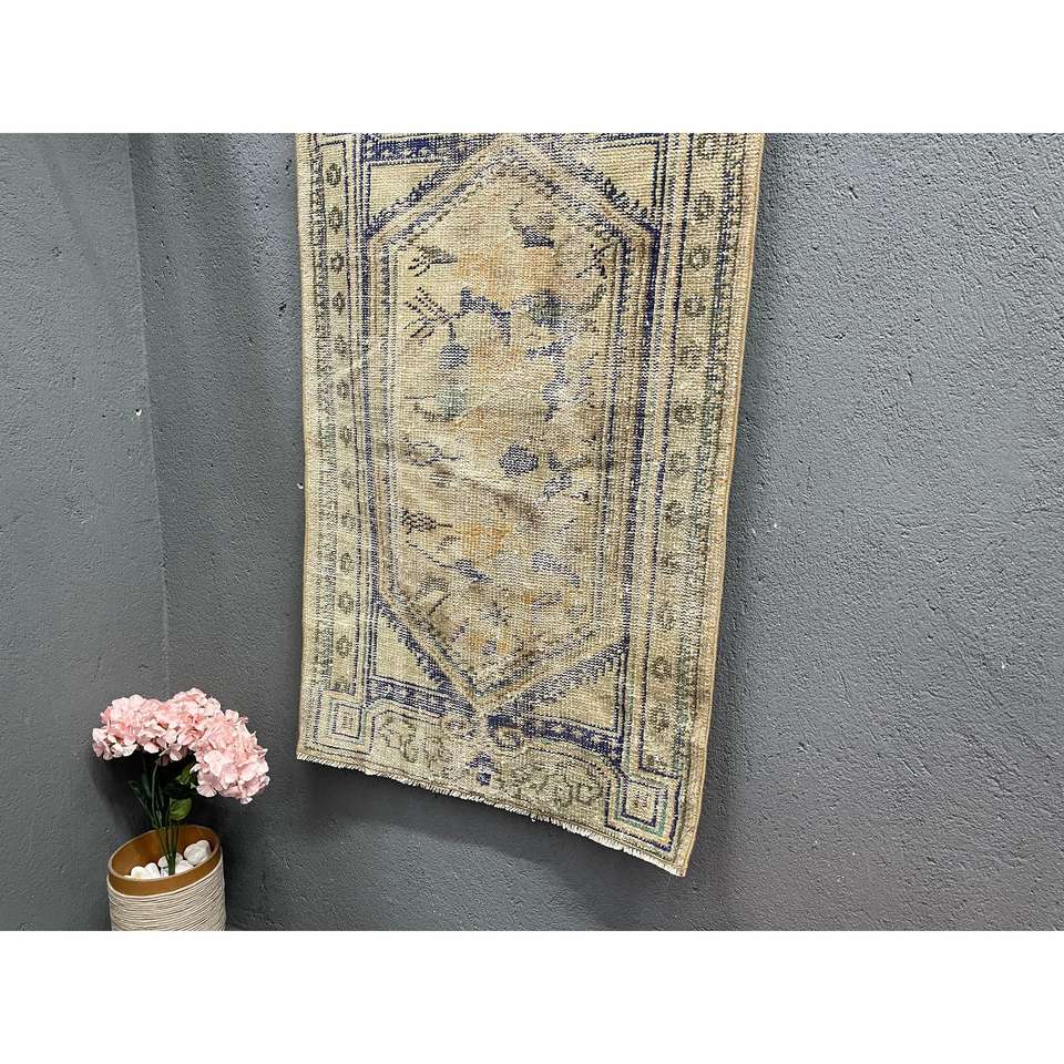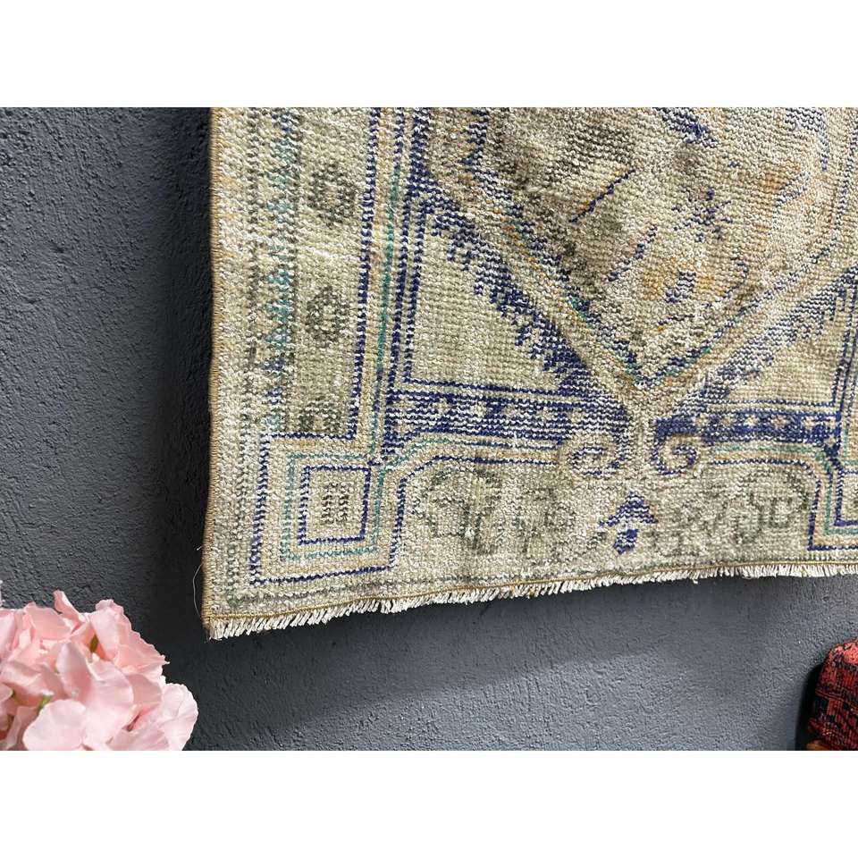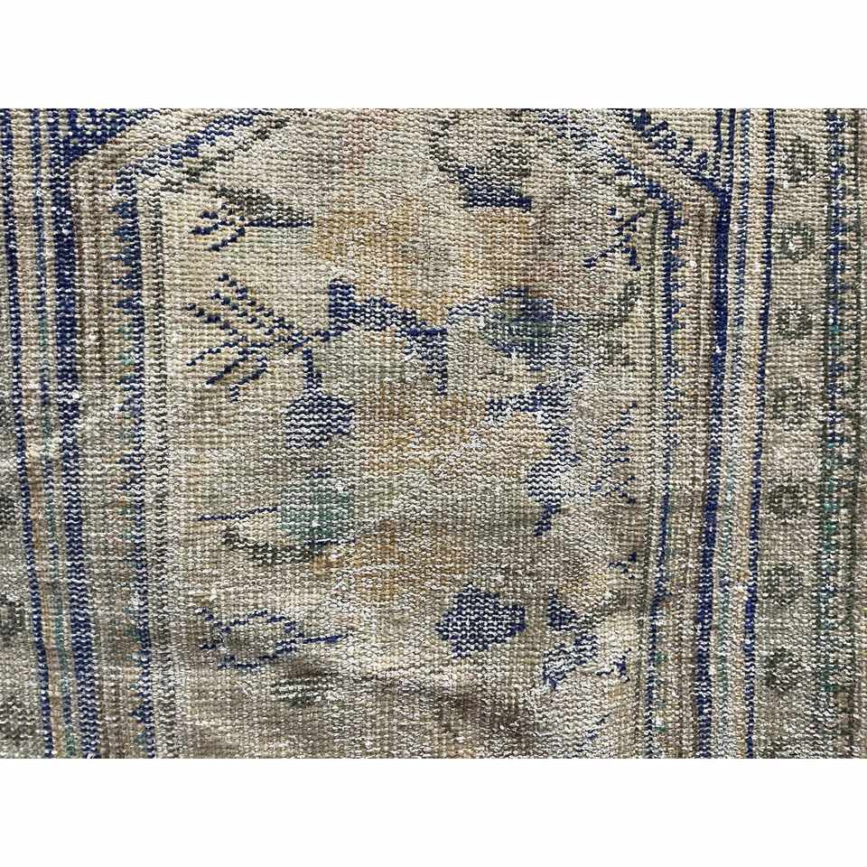 Alfombra Turca de 2.8x4.2 pies, Alfombra Pequeña Vintage, Alfombra de Lana con Diseño de Plantas y Árboles en Azul y Marrón