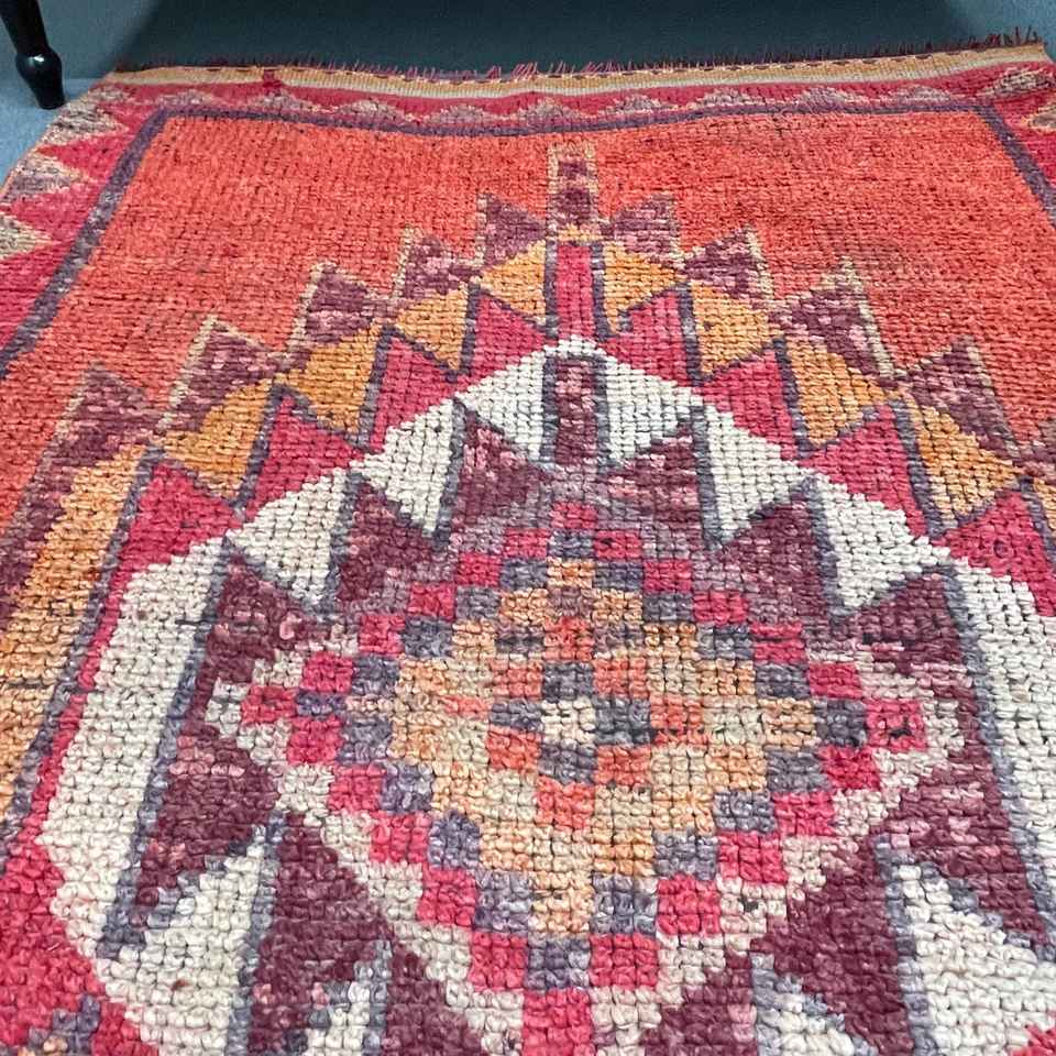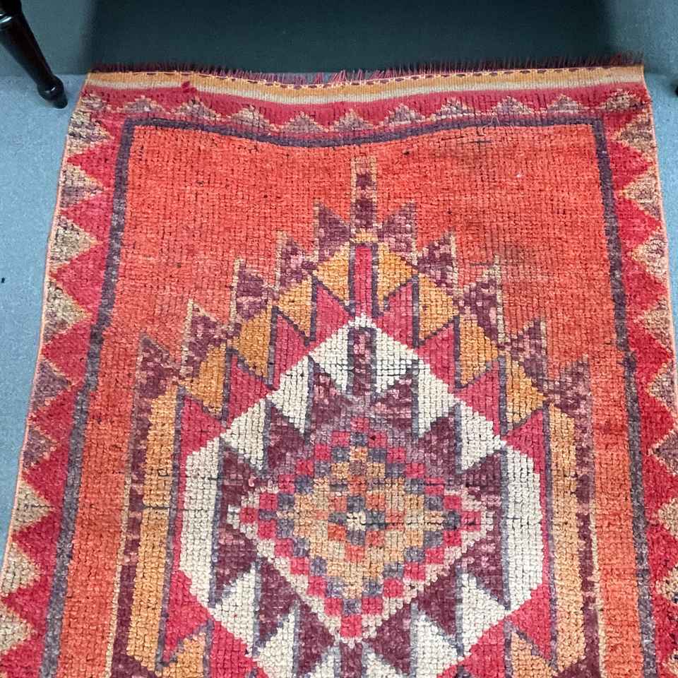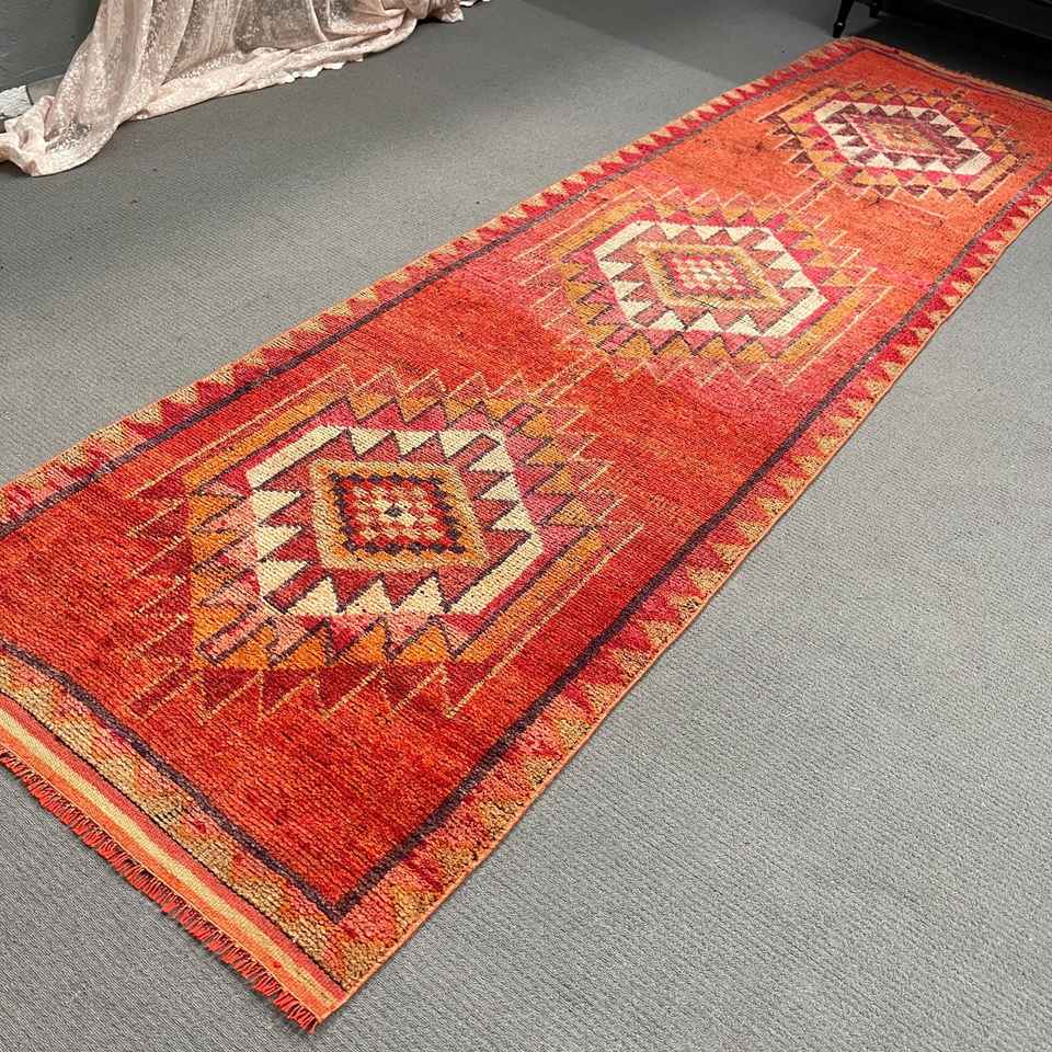 Alfombra Turca de 3.3x12.4 pies, Alfombra Vintage, Alfombra de Lana con Diseño Floral Rojo