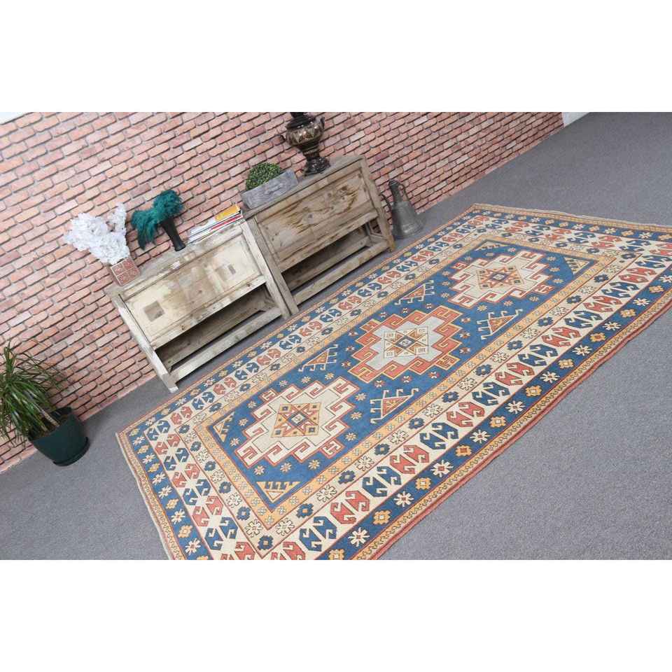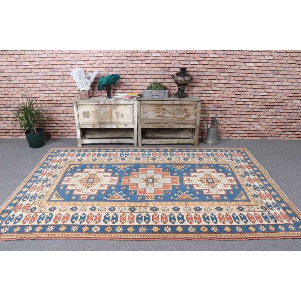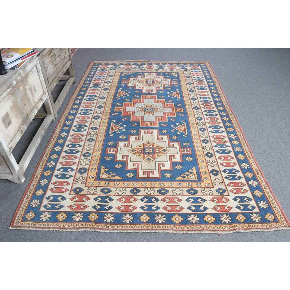 Alfombra Turca de 5.5x8.3 pies, Alfombra Vintage Grande, Alfombra de Lana Azul Sólida