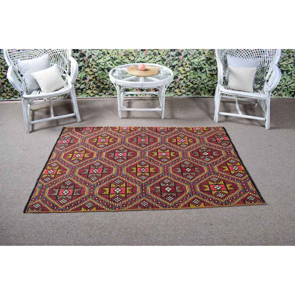Alfombra Turca de 3.6x5.3 pies, Alfombra Sólida Roja y Azul de Lana