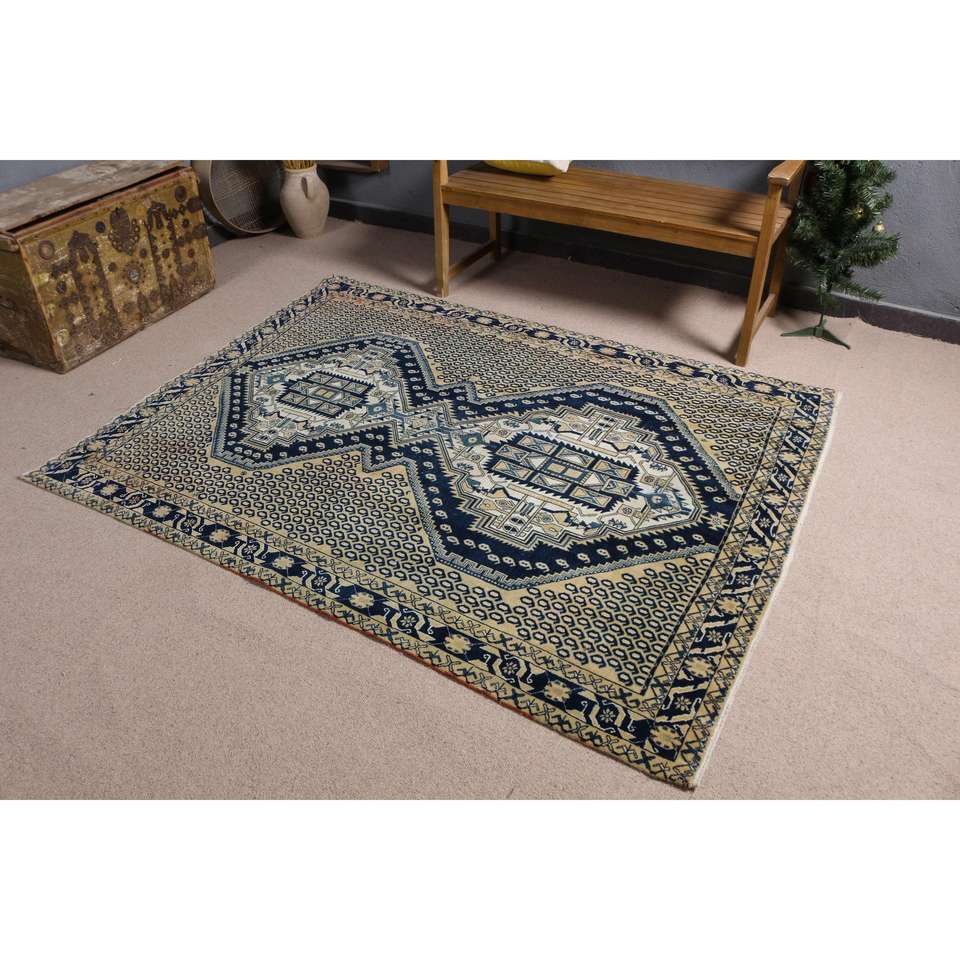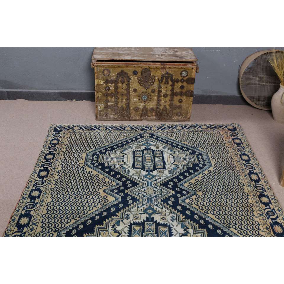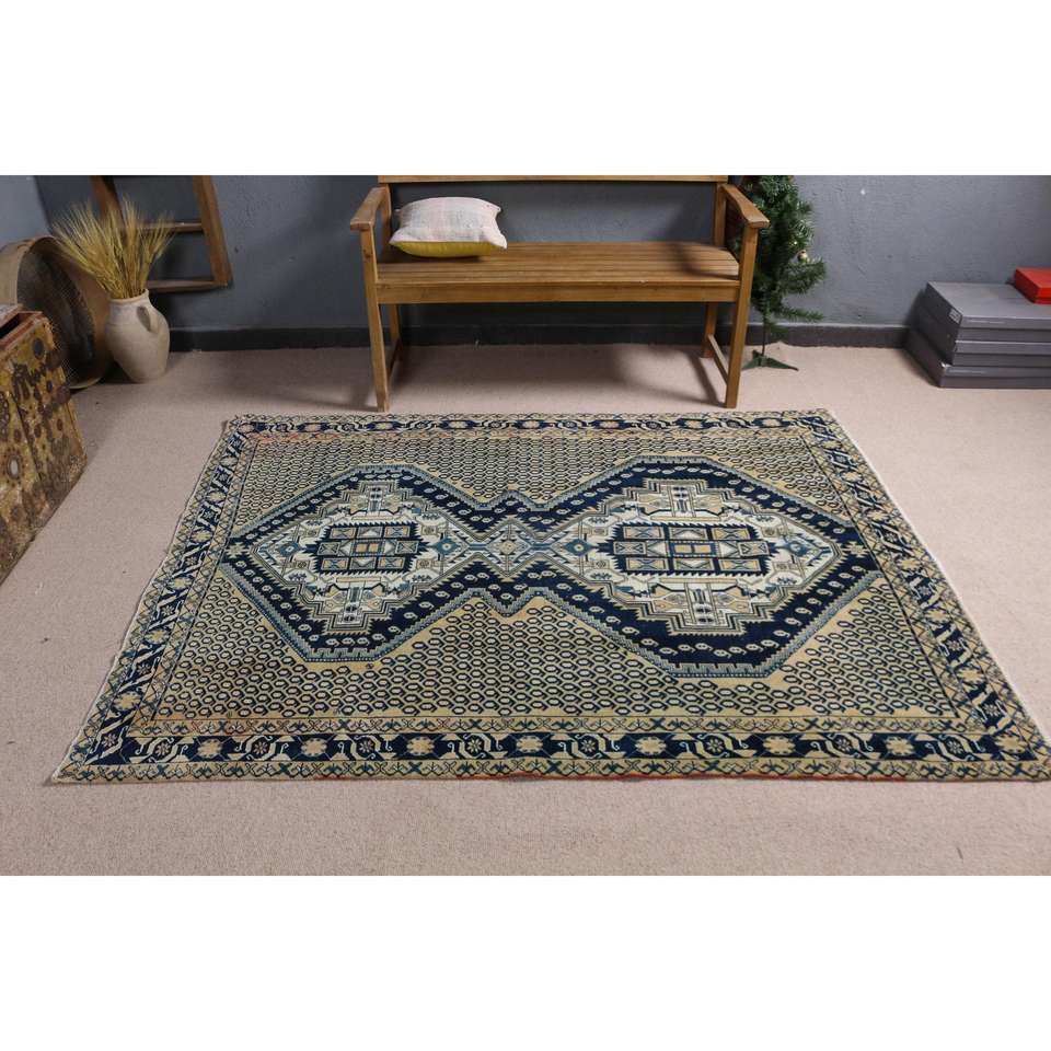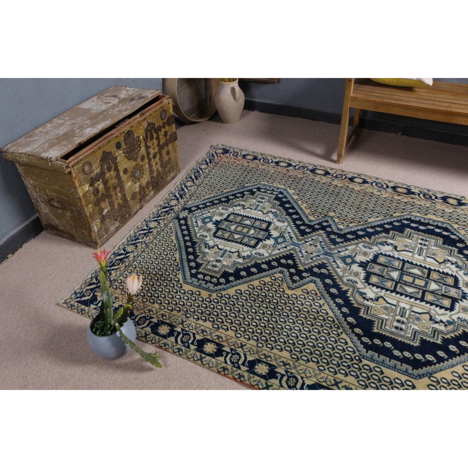 Alfombra Turca de 5x6.6 pies, Alfombra de Lana a Rayas Azules Vintage