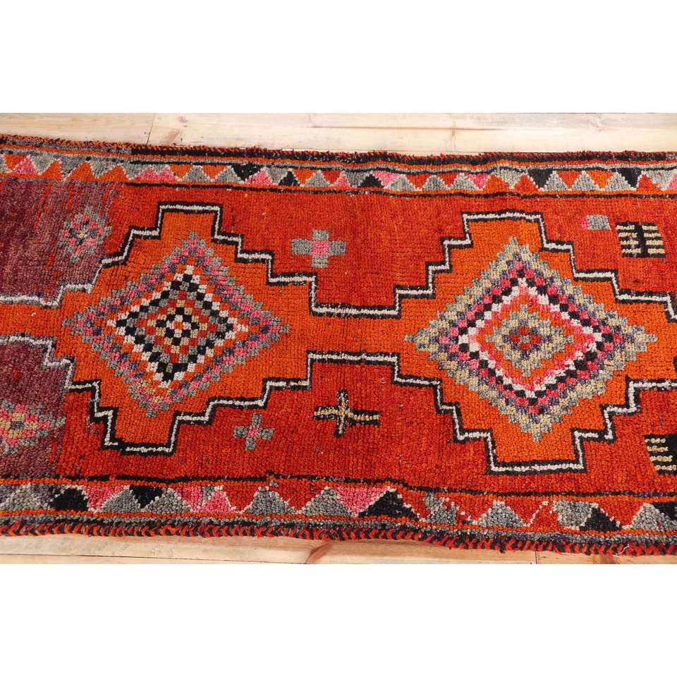 Alfombra Turca Herki Runner de 3.2x12.5 pies (99x380 cm), Alfombra Oriental de Lana Roja Vintage
