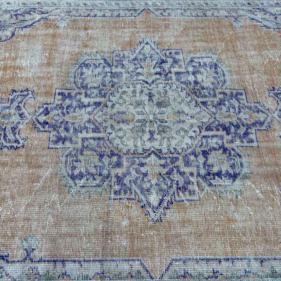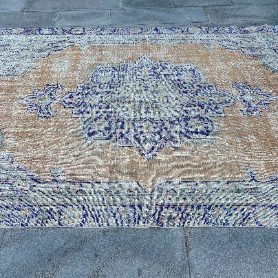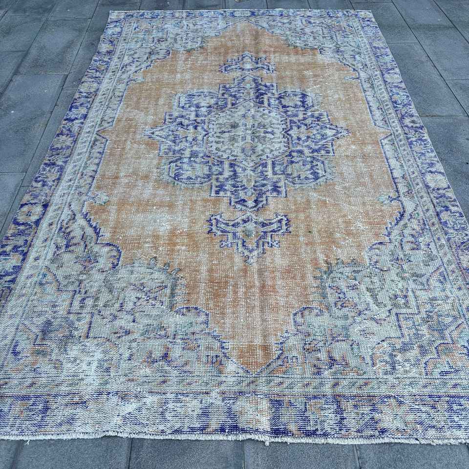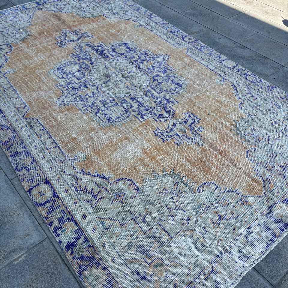 Alfombra Turca Grande de 5.9x9.6 pies, Ecológica, Vintage, Azul, con Diseño de Patchwork, Base de Látex y Pelo Mediano