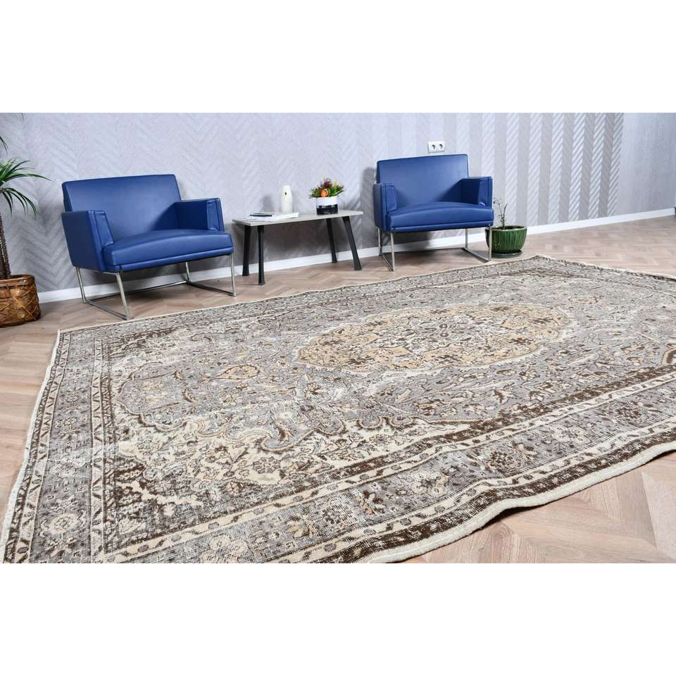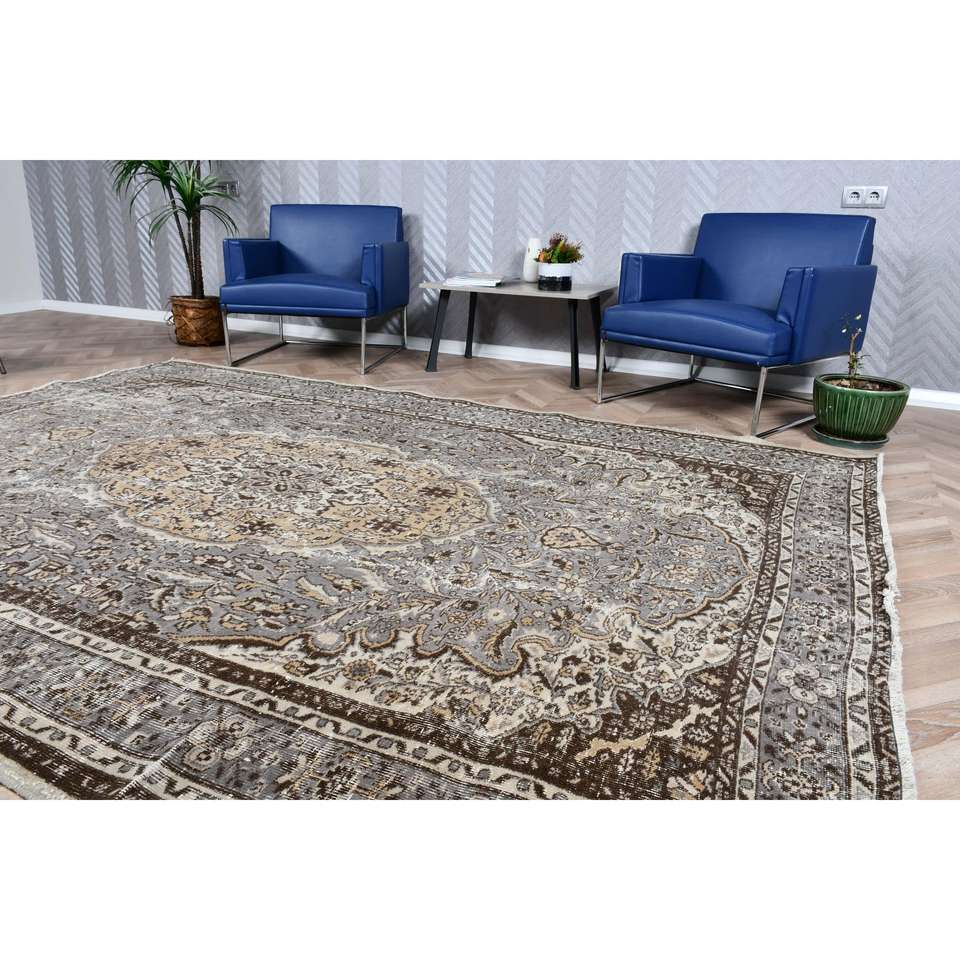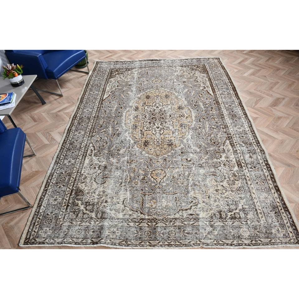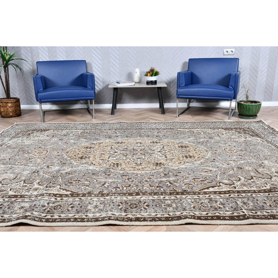 Alfombra Turca Extra Grande, Alfombra Vintage de 7x10.1 pies, Alfombra de Lana Gris
