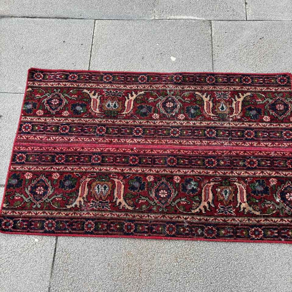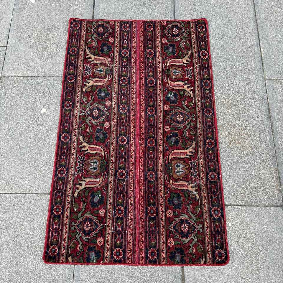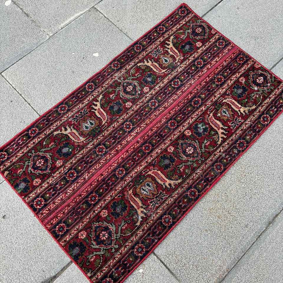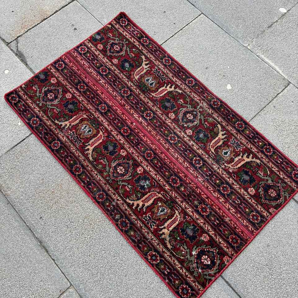 Alfombra Turca de 1.6x2.7 pies, Alfombra Vintage de Lana con Estampado Animal Rojo y Azul