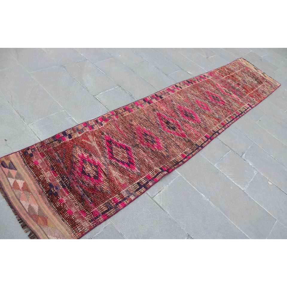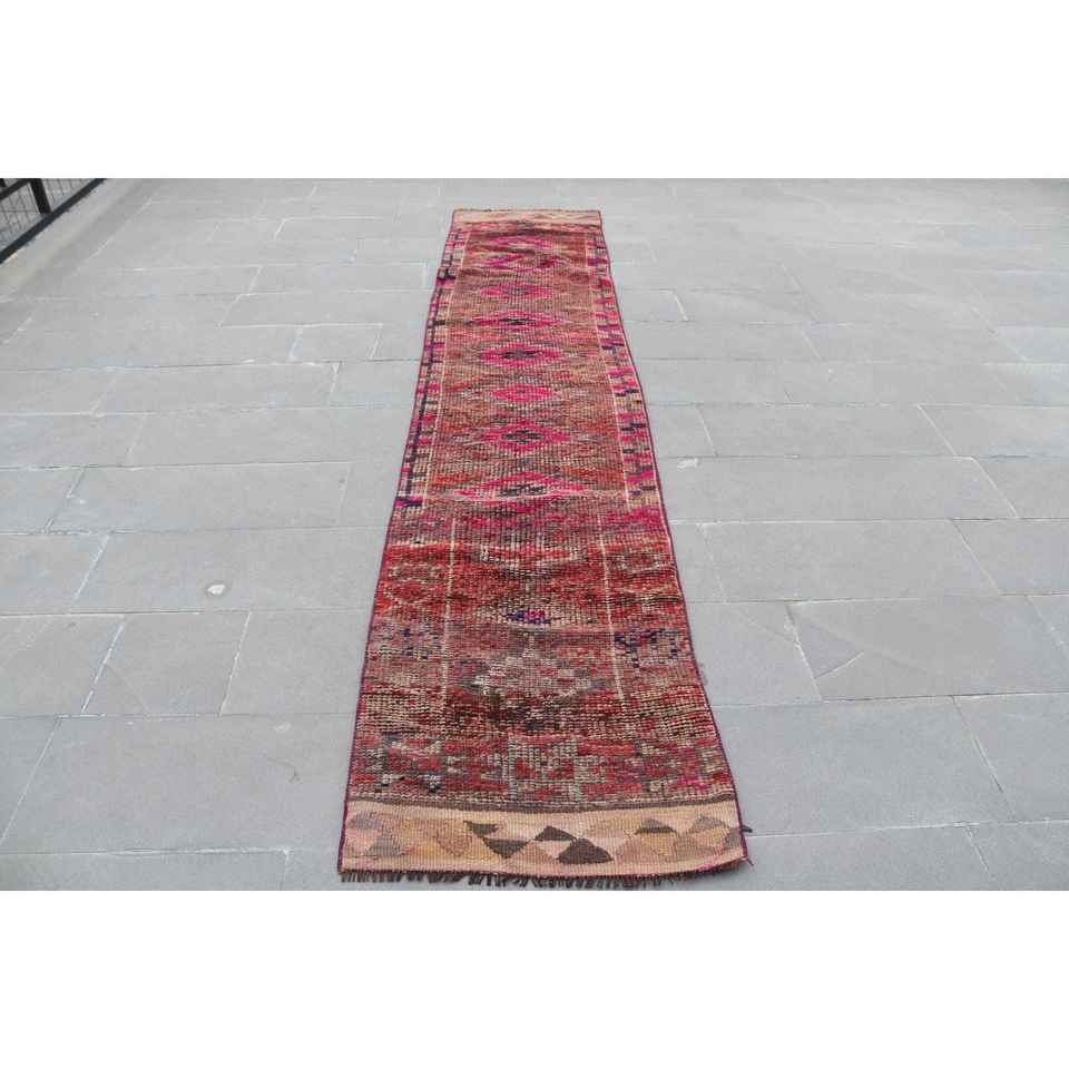 Alfombra Turca, Alfombra Vintage de 2.3x11.3 pies, Alfombra Herki Roja y Azul Degradada