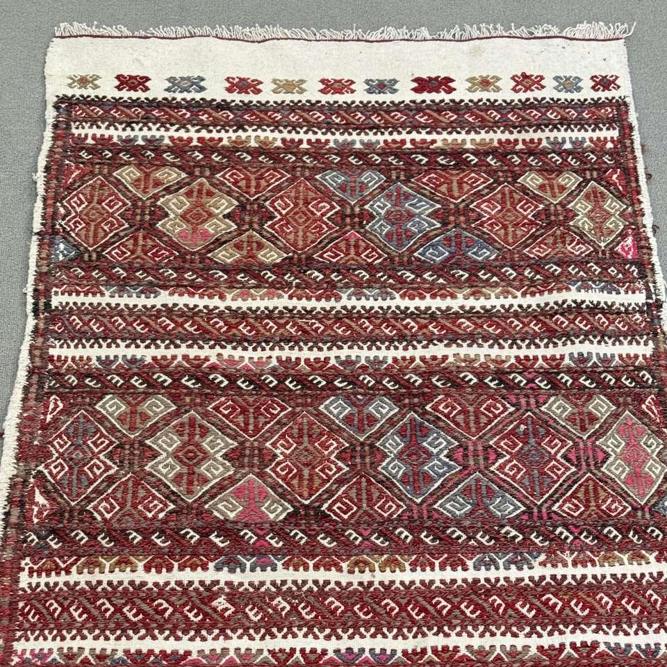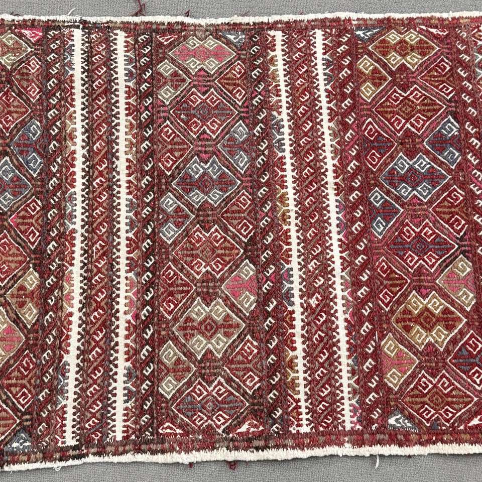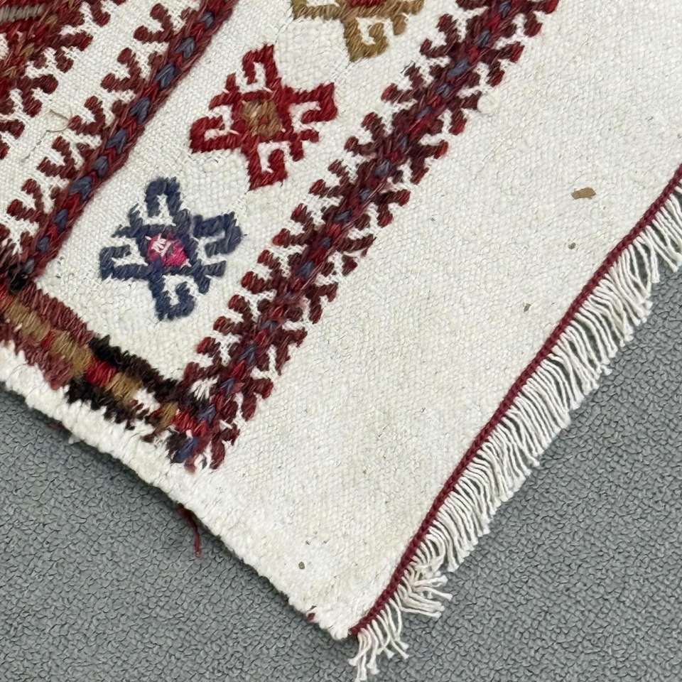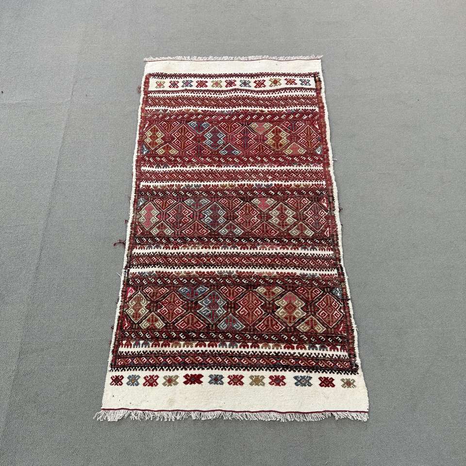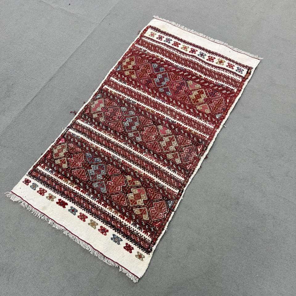 Alfombra Turca, Alfombra Pequeña de 2.3x4.4 pies, Alfombra de Lana Kilim Roja y Azul