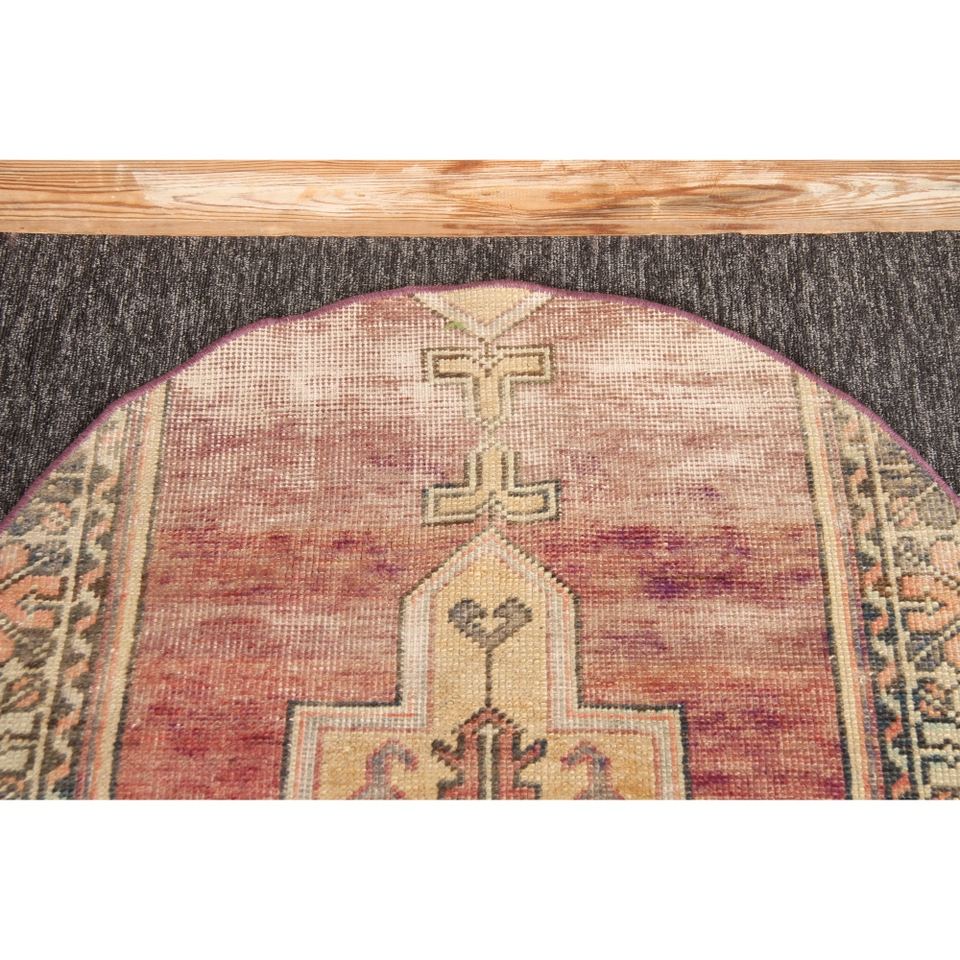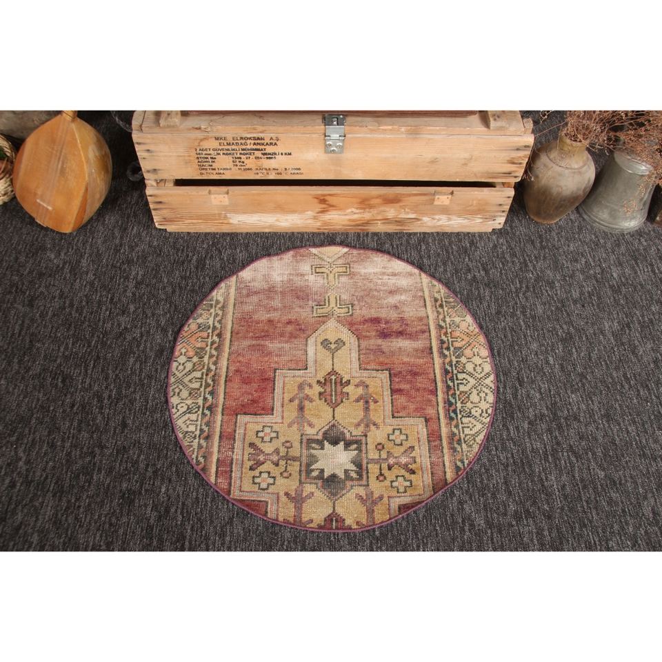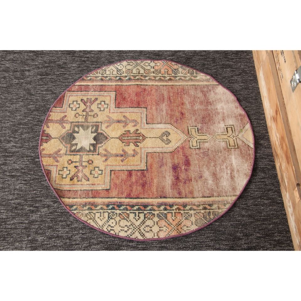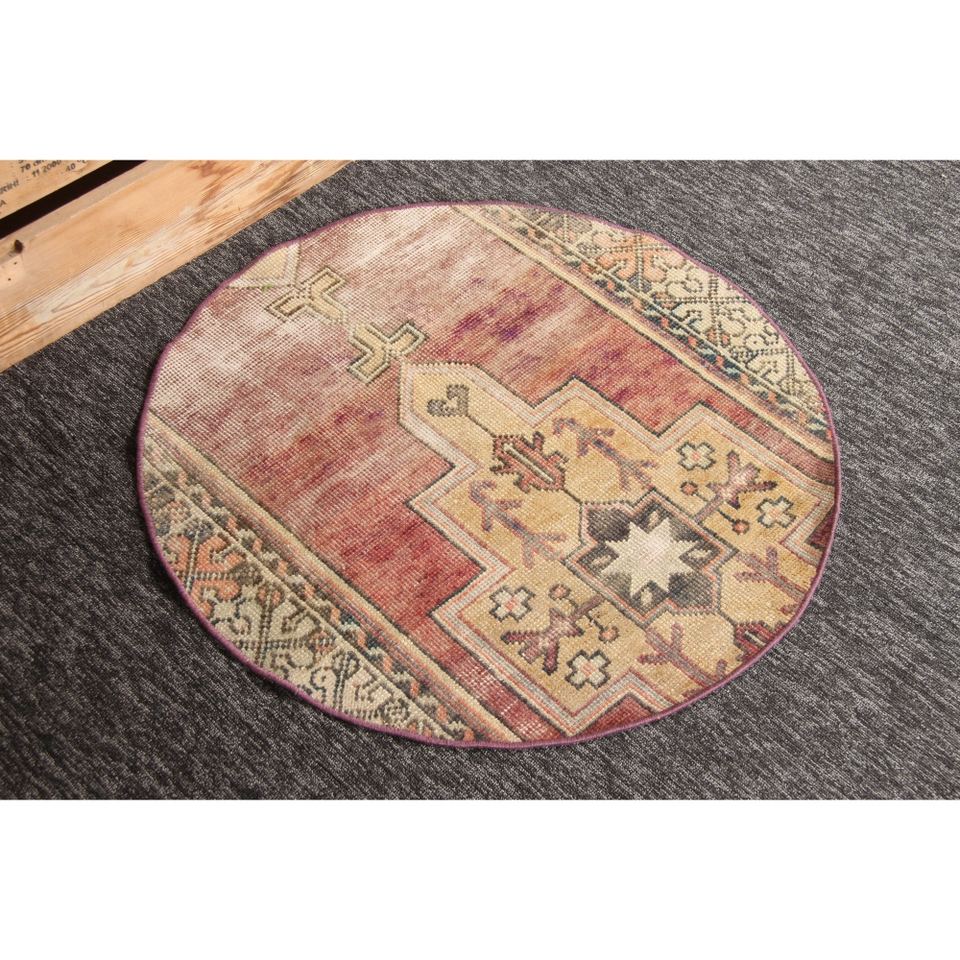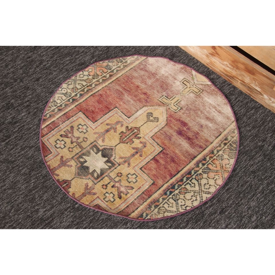 Alfombra turca, alfombra vintage de 2.6x2.6 pies, geométrica morada y verde con elementos florales.