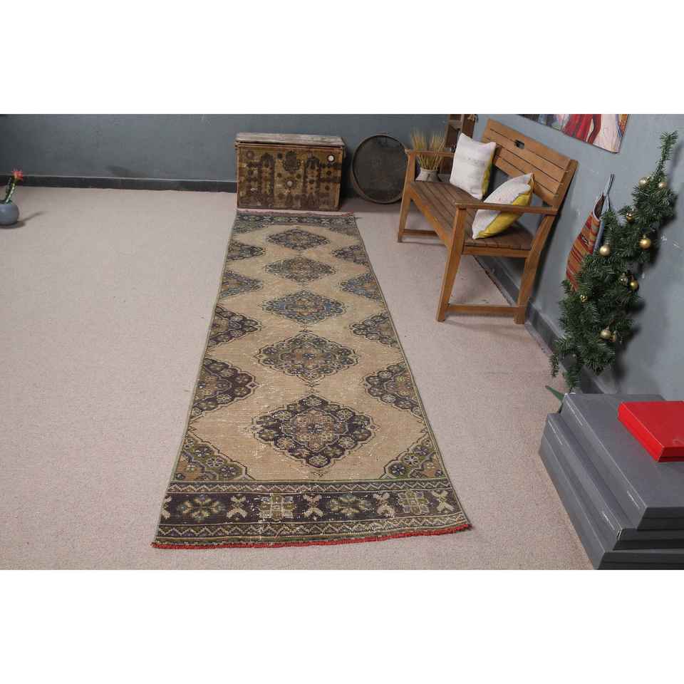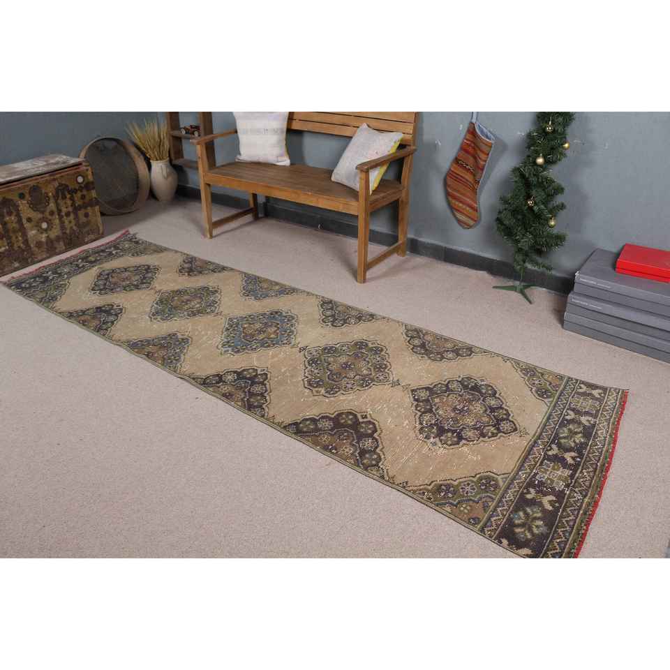 Alfombra Turca, Alfombra de Pasillo de 3.1x10.5 pies, Alfombra de Lana Marrón y Azul