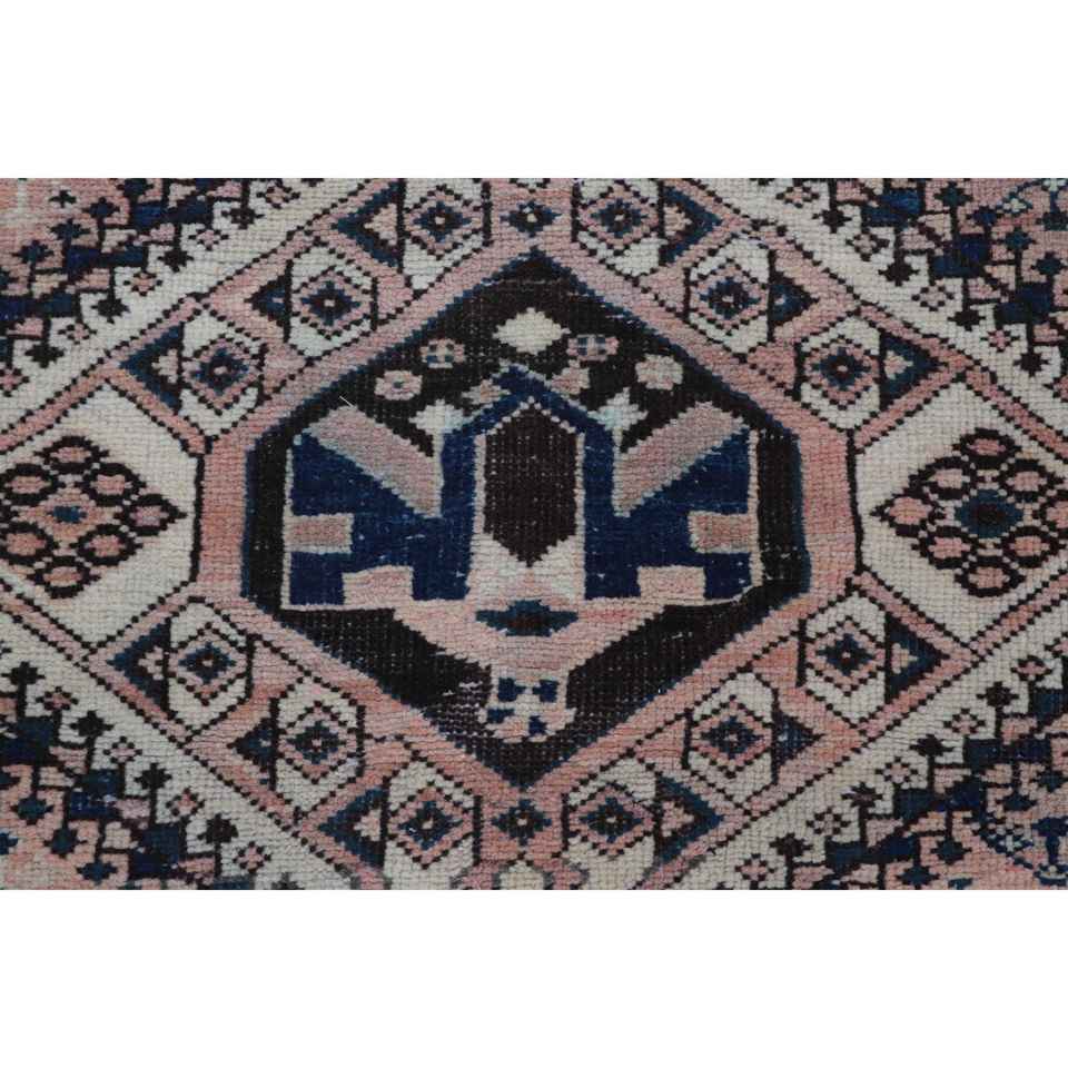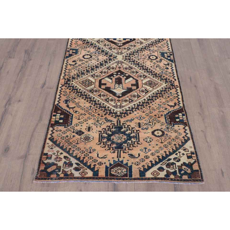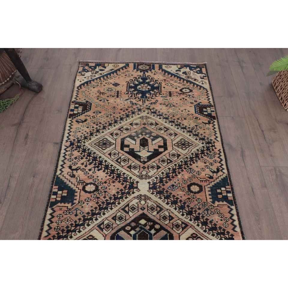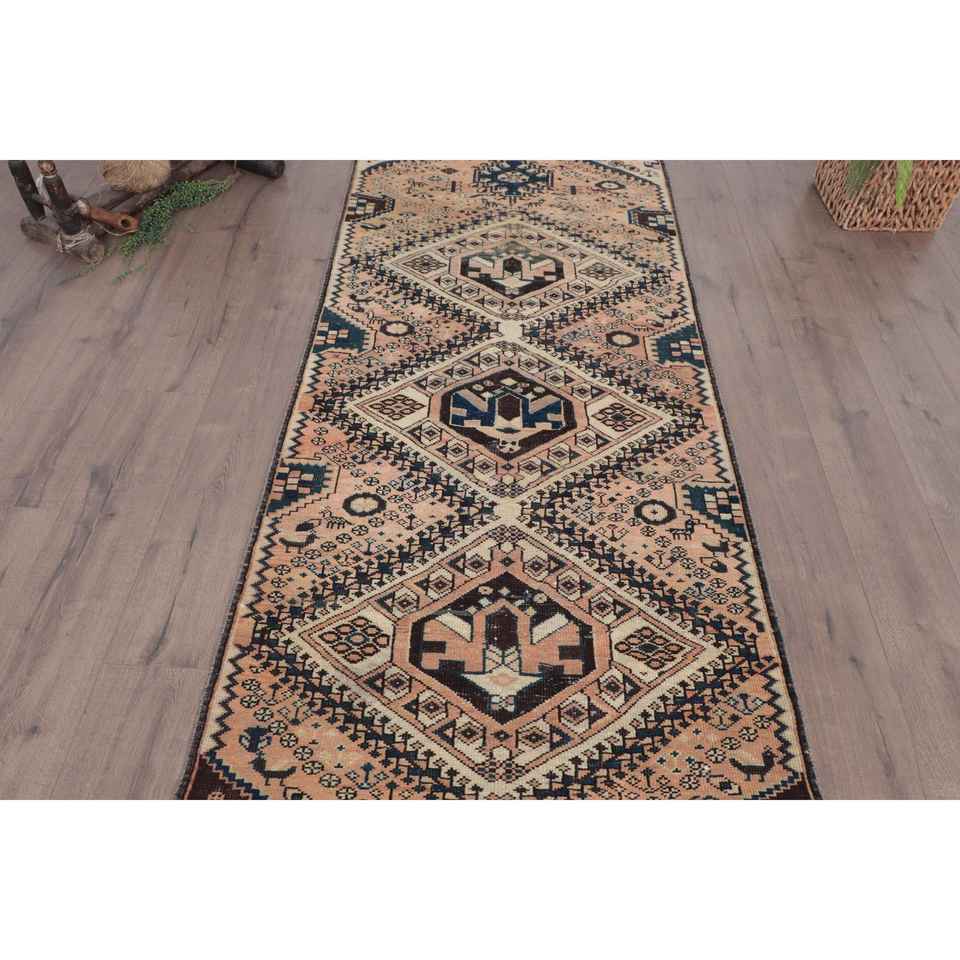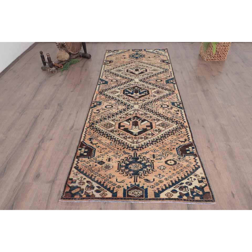 Alfombra Turca, Alfombra Vintage de 3.2x8.6 pies, Alfombra Marroquí de Lana Azul Marrón