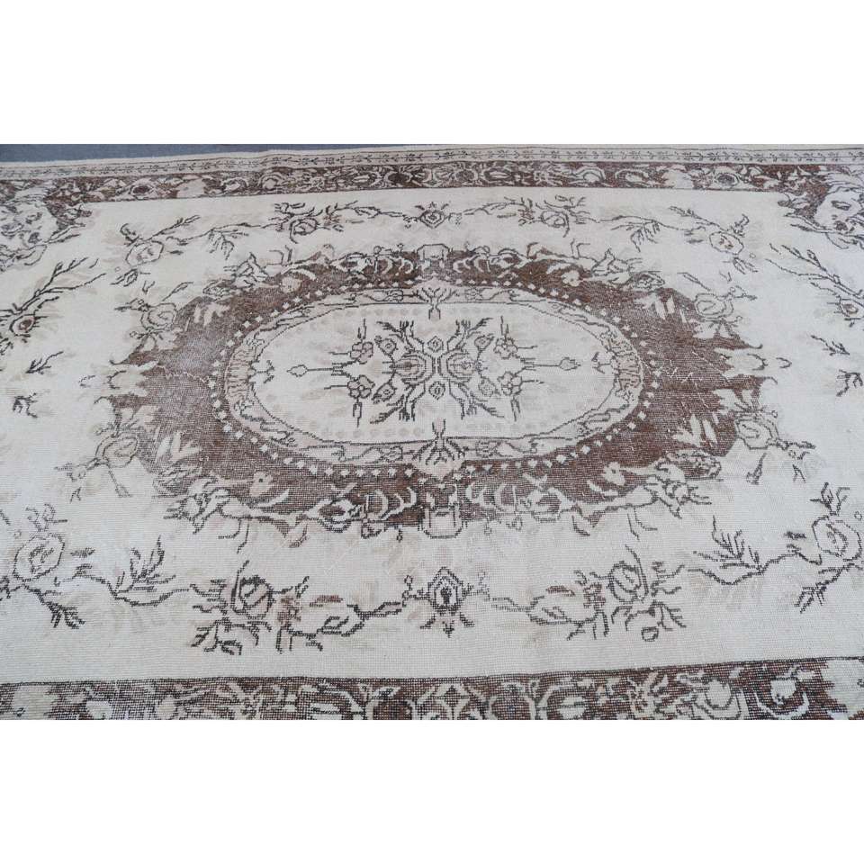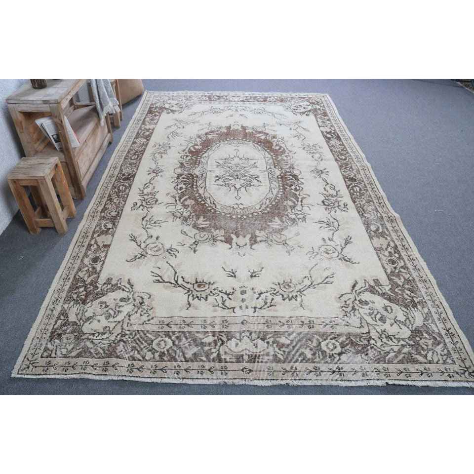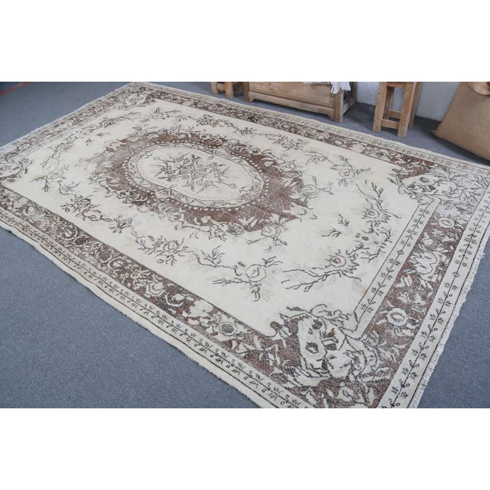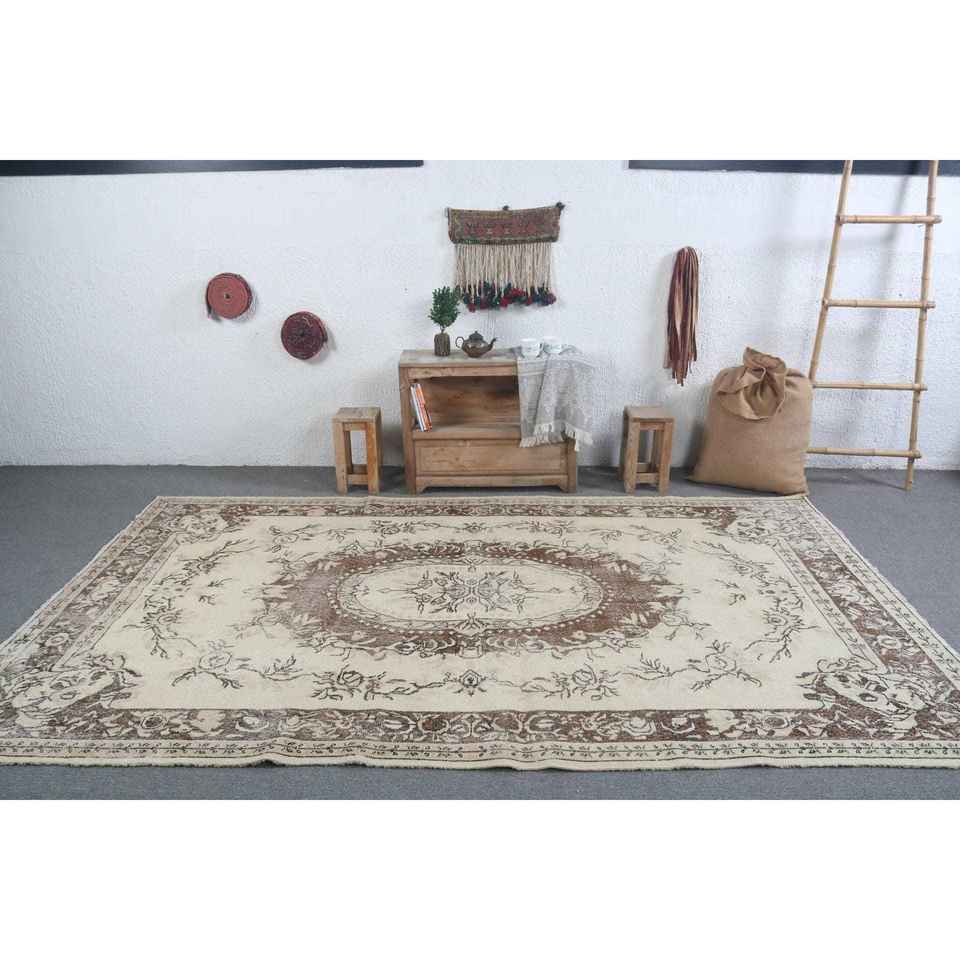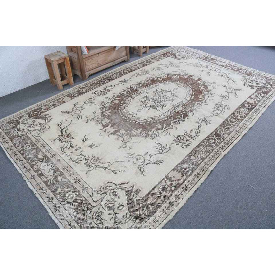 Alfombra Turca, Alfombra Vintage Grande de 5.9x10.1 pies, Alfombra Floral Marrón y Blanca
