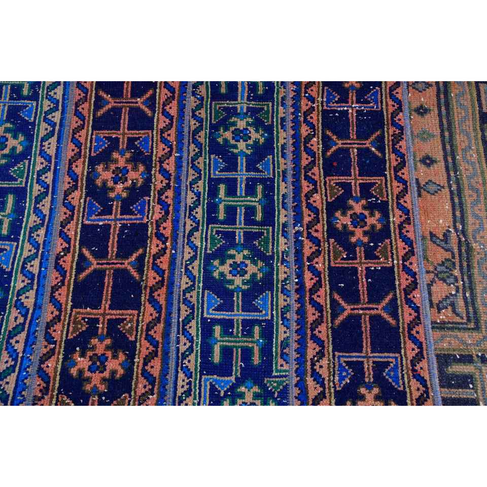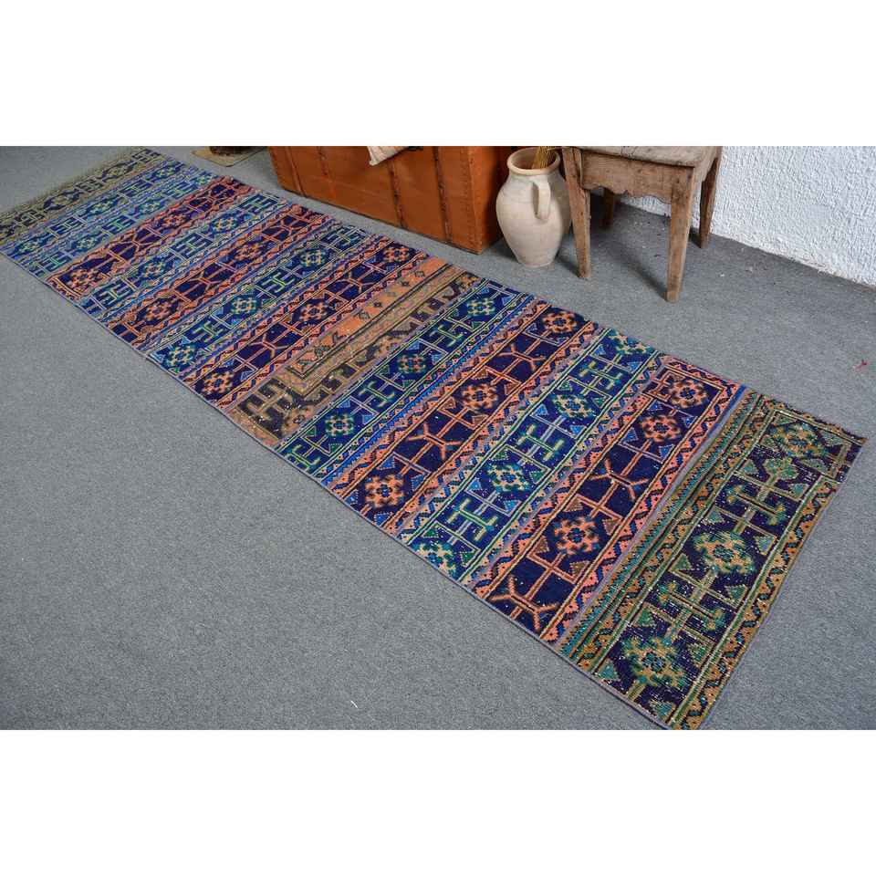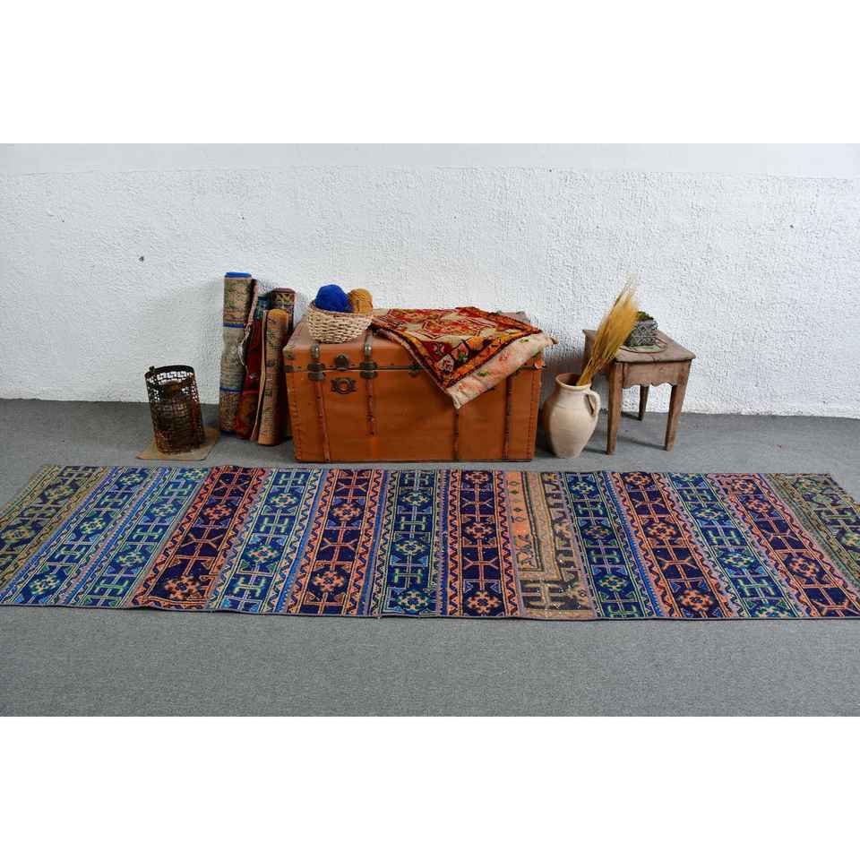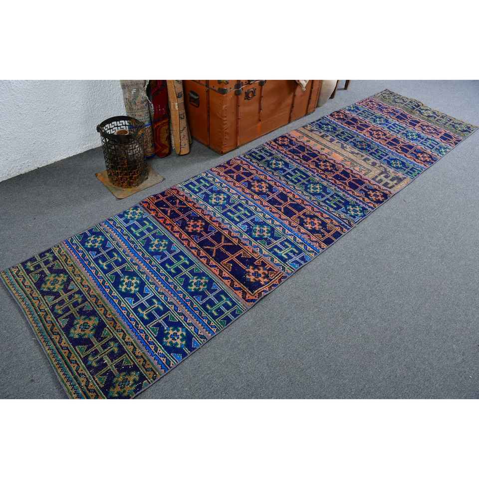 Alfombra Turca, Alfombra de Pasillo de 2.8x10.7 pies, Alfombra Vintage Azul de Lana del Suroeste