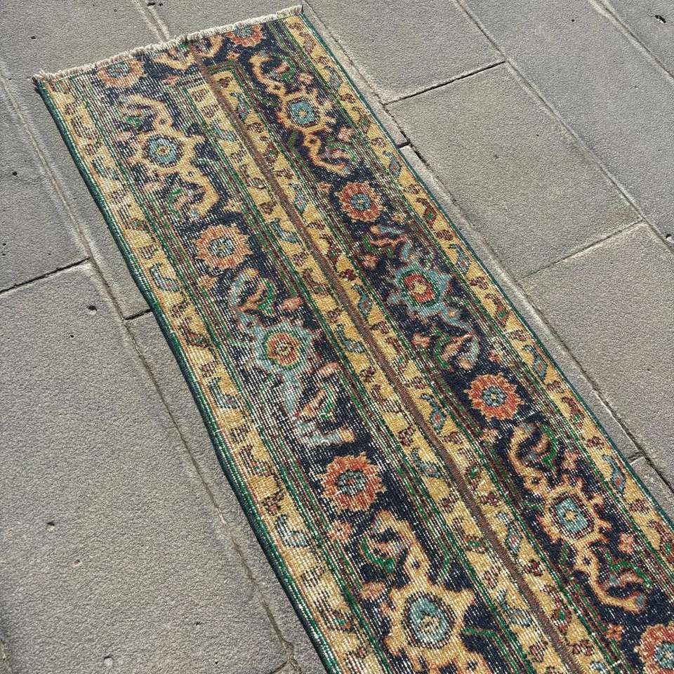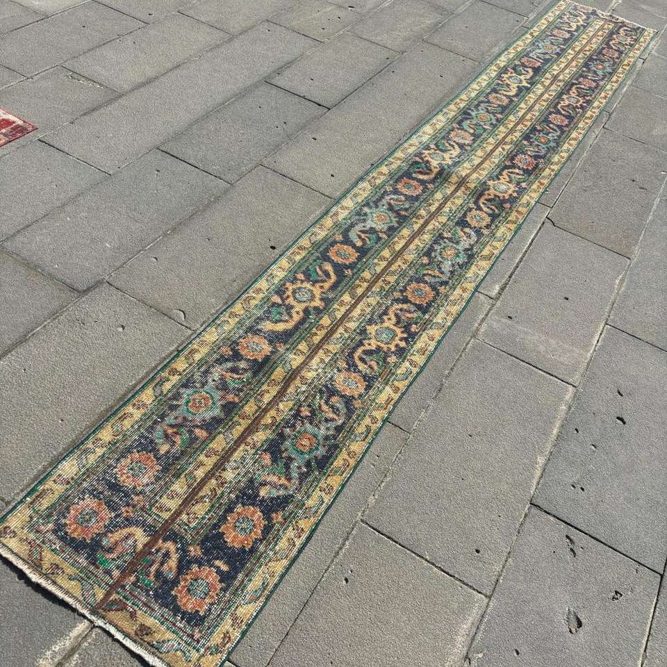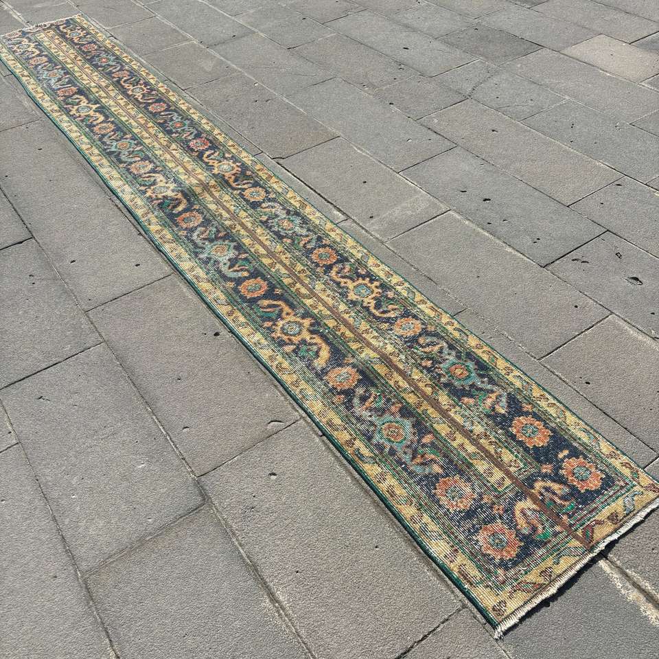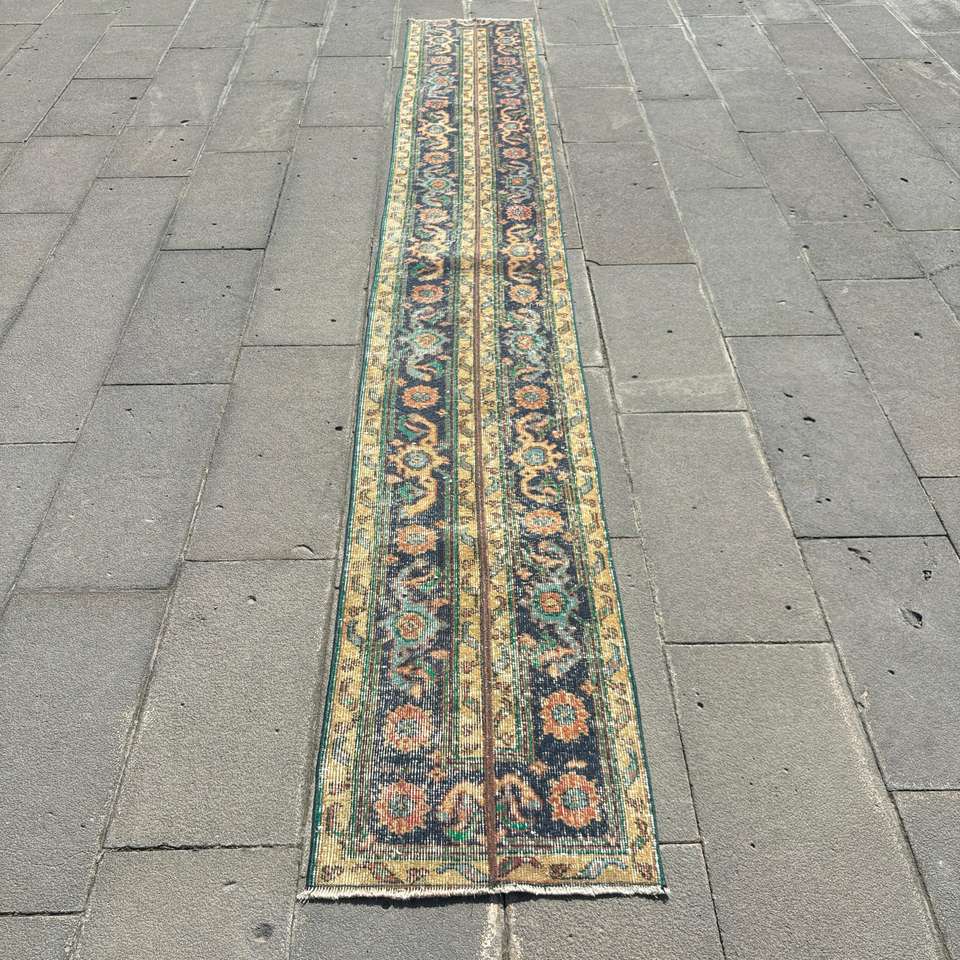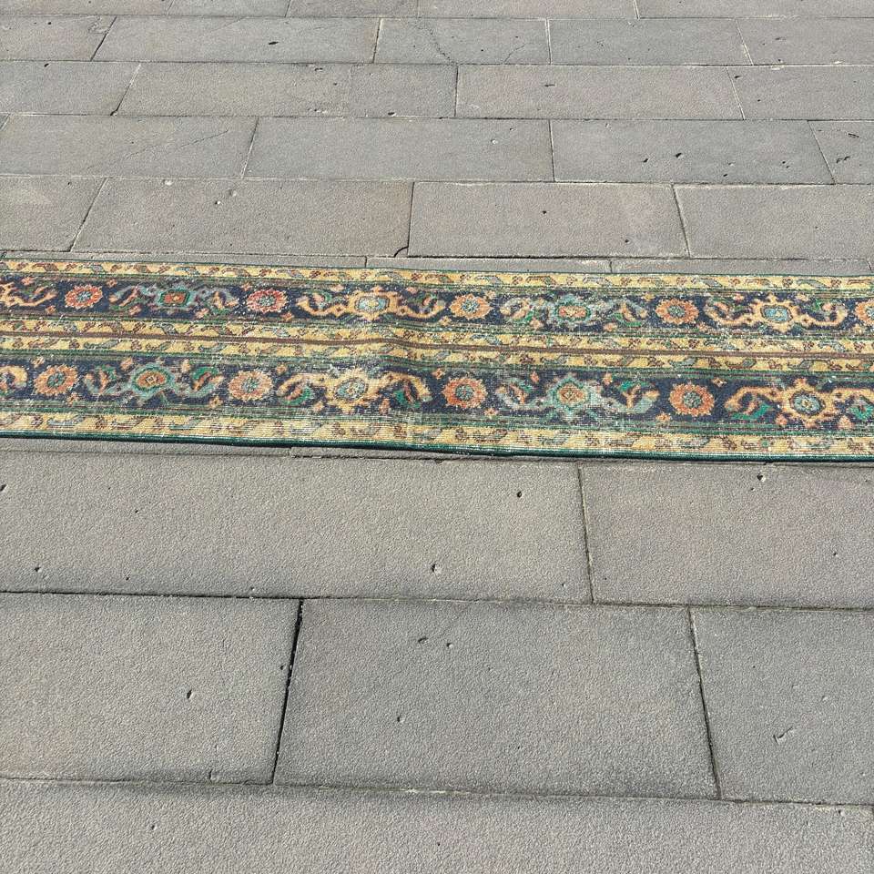 Alfombra Turca, Alfombra Vintage de 1.7x12.3 pies, Alfombra de Lana Azul