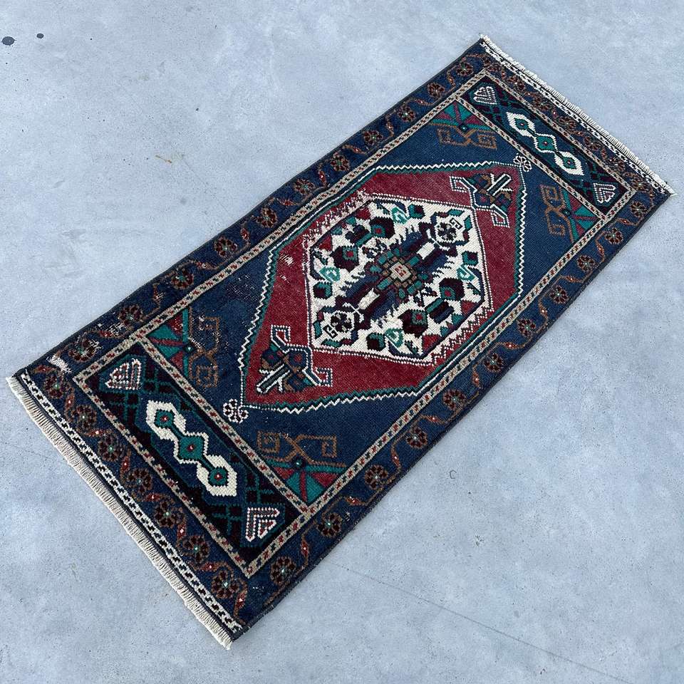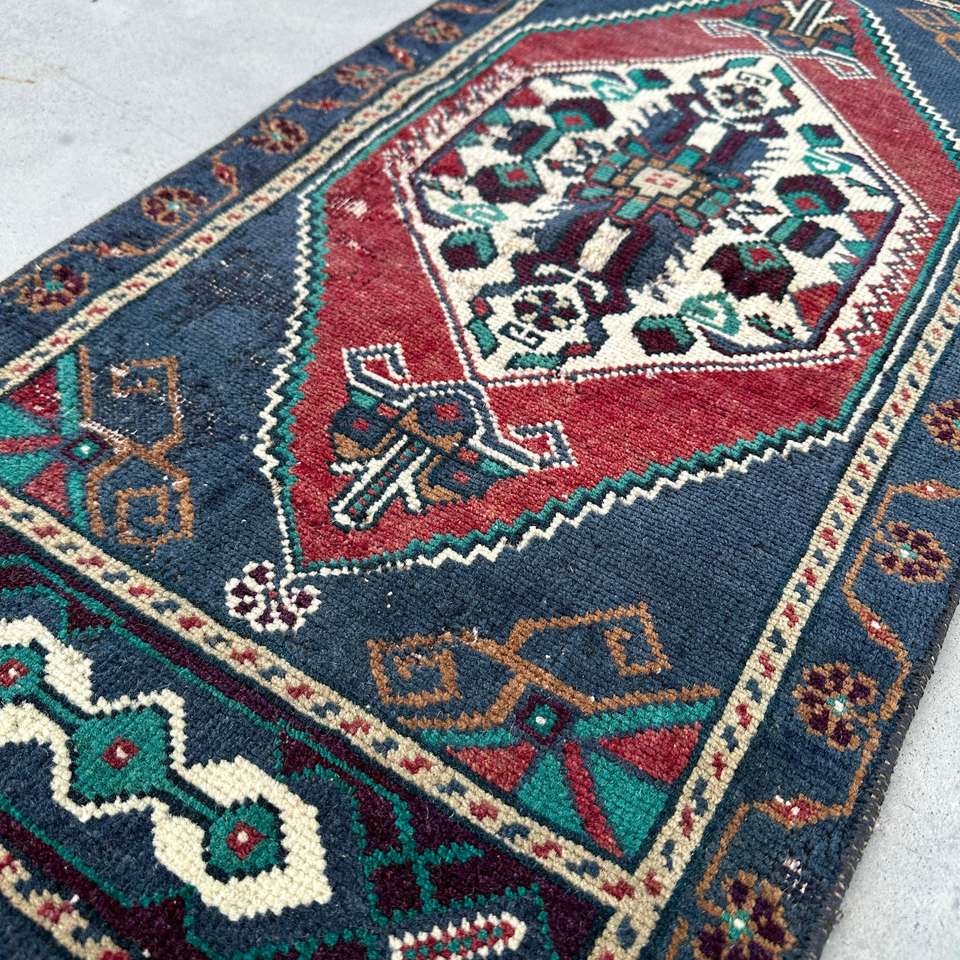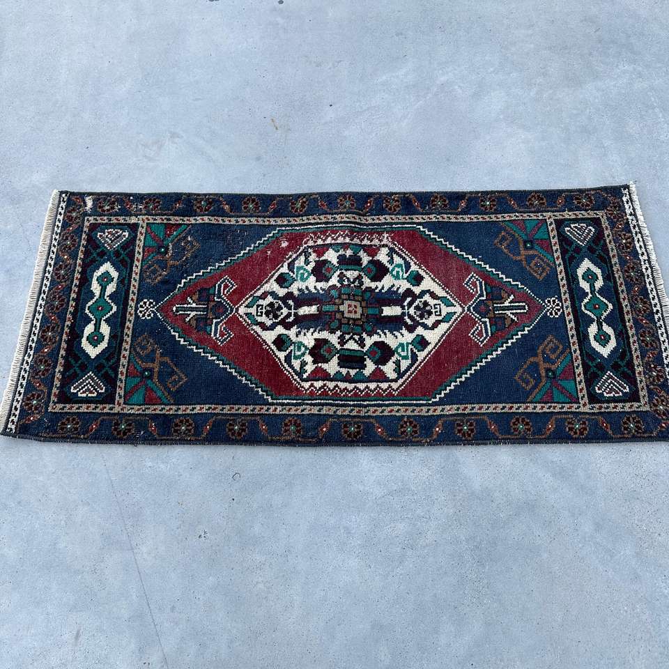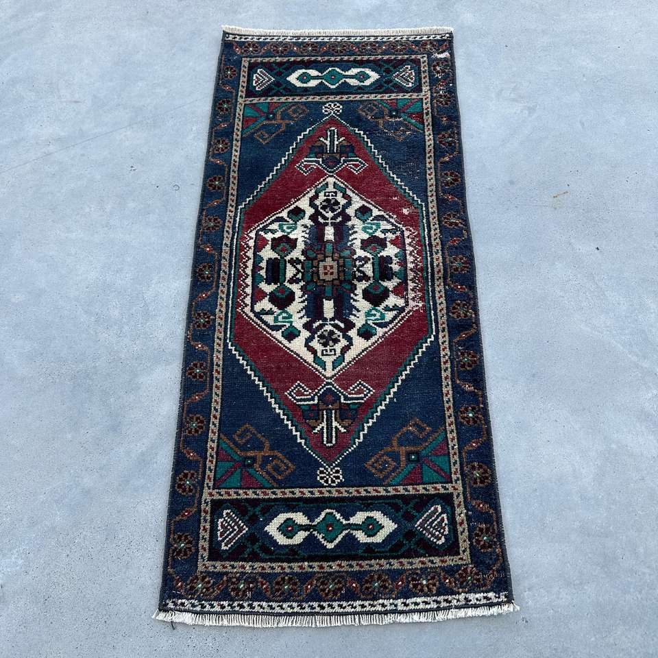 Alfombra Turca Pequeña de 1.5x3.3 pies, Alfombra Floral Azul y Roja de Lana