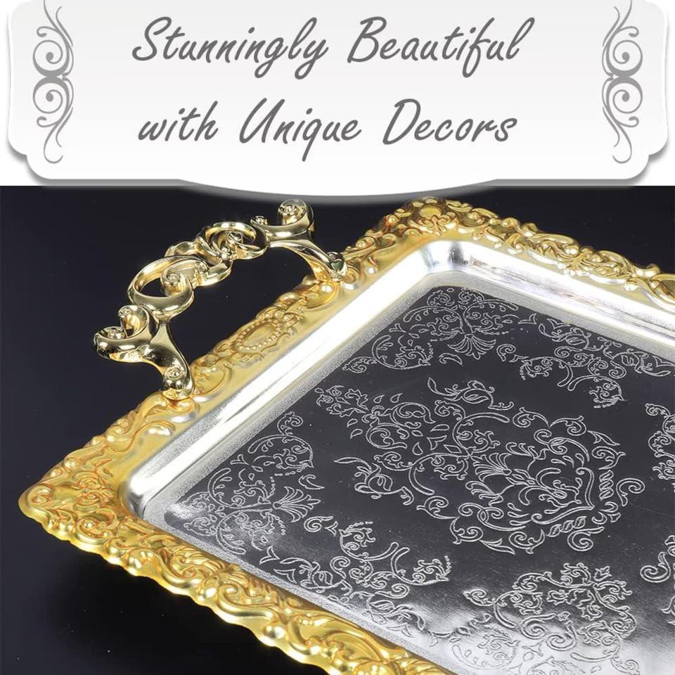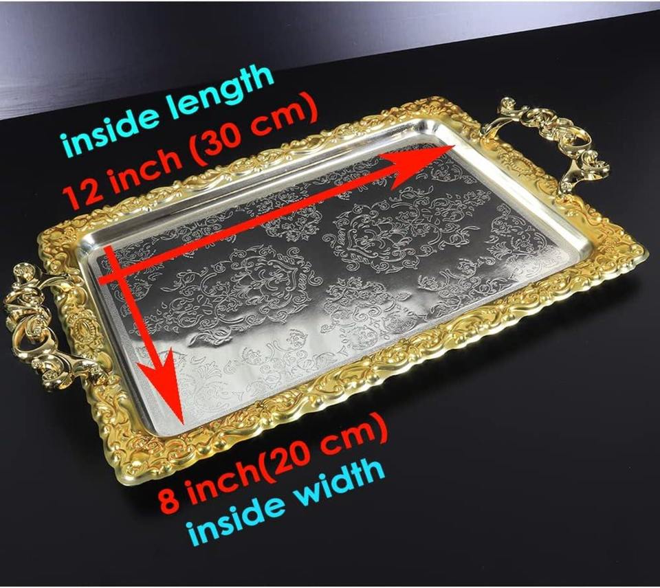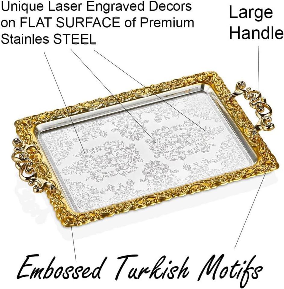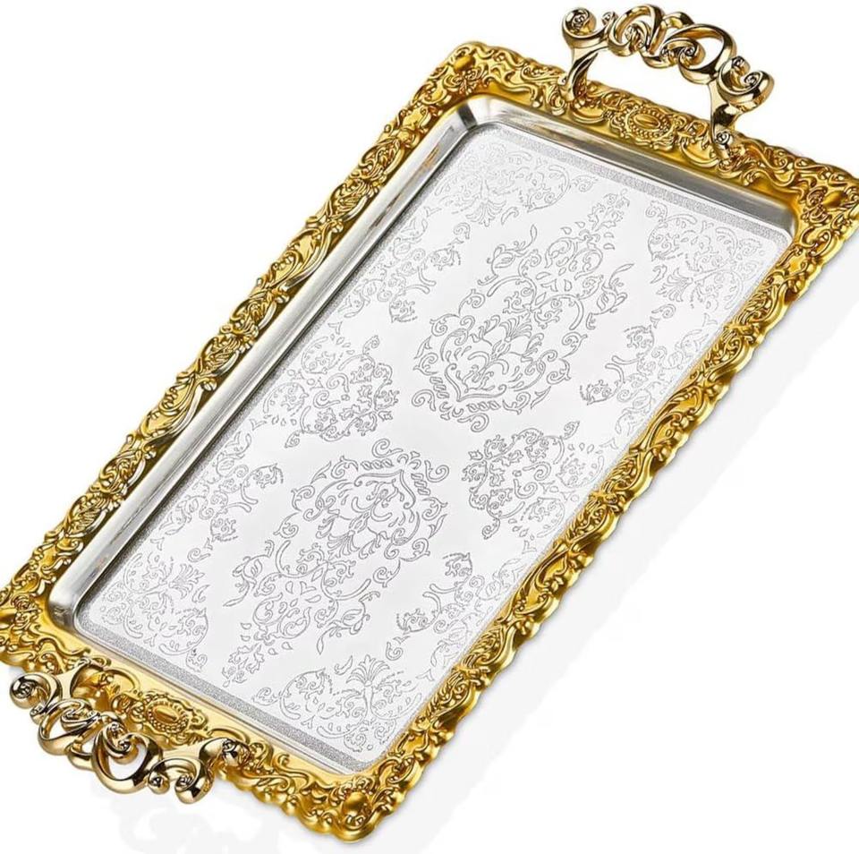 Bandeja para servir té y café al estilo turco con marco de metal dorado y superficie de espejo plateada, ideal para ocasiones especiales y regalos.