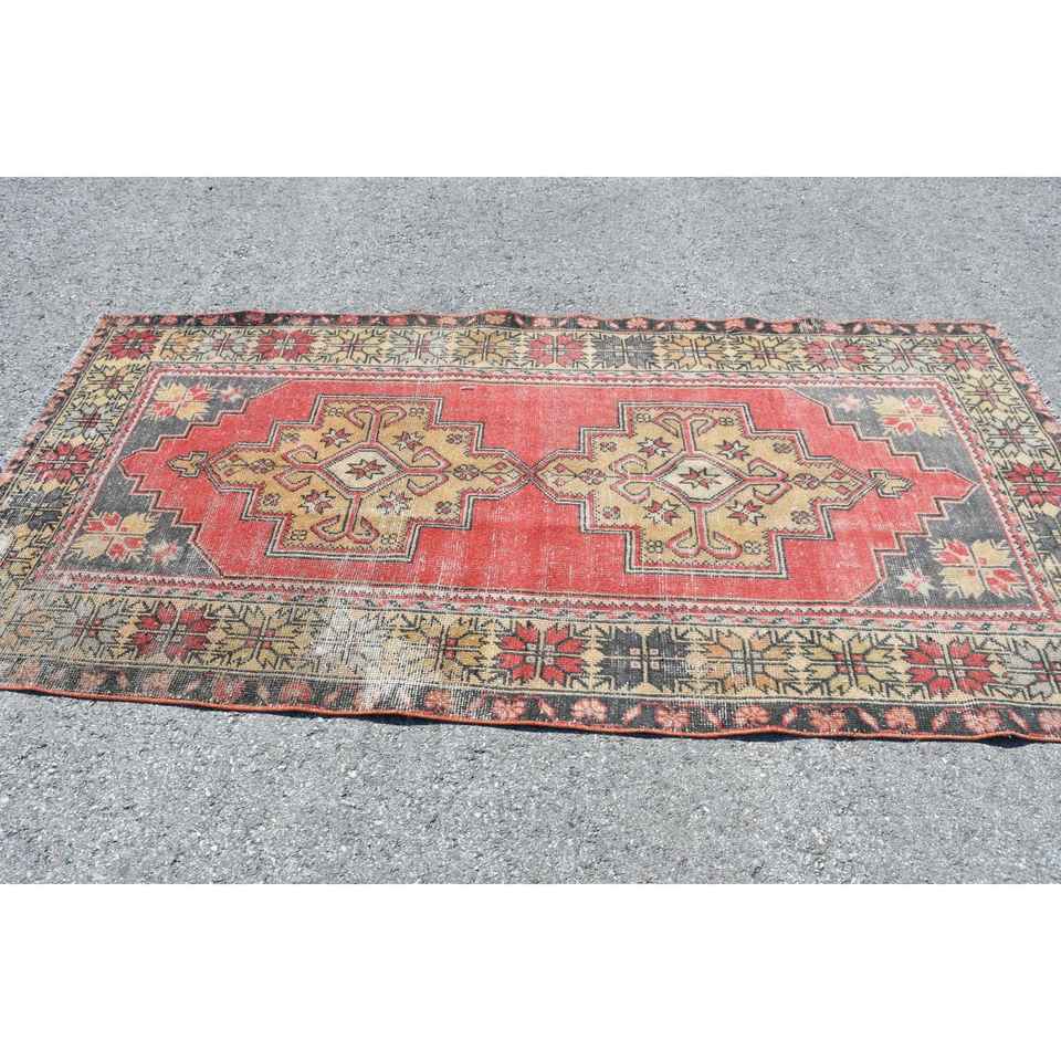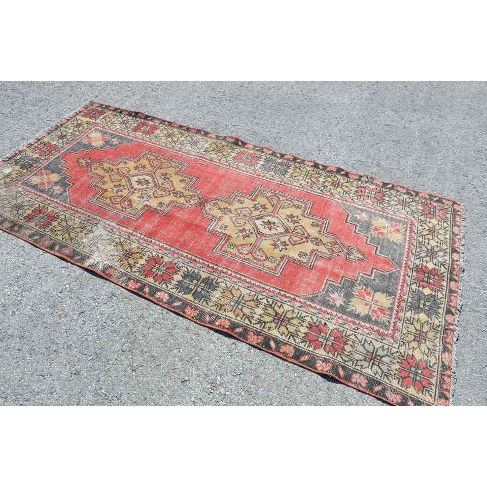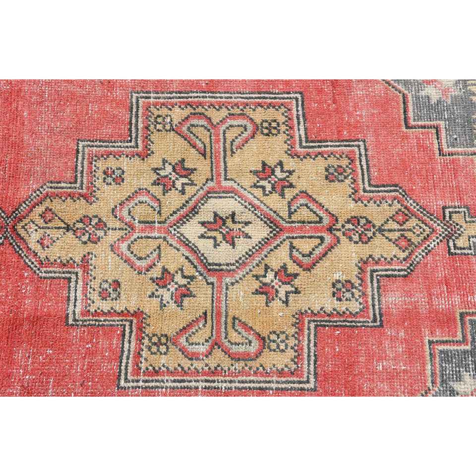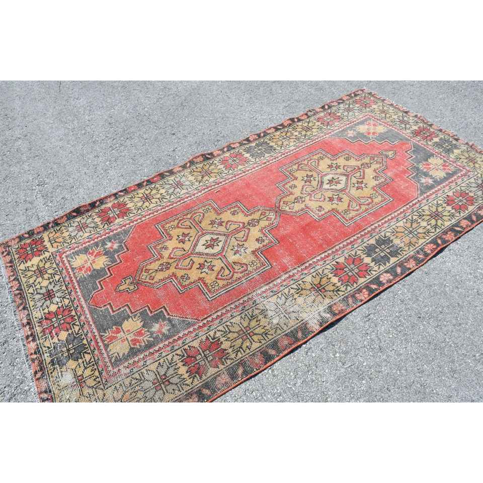 Alfombra Turca Vintage Ecológica de 3.9x8.1 pies, Alfombra de Lana Roja con Diseño de Patchwork y Base de Látex