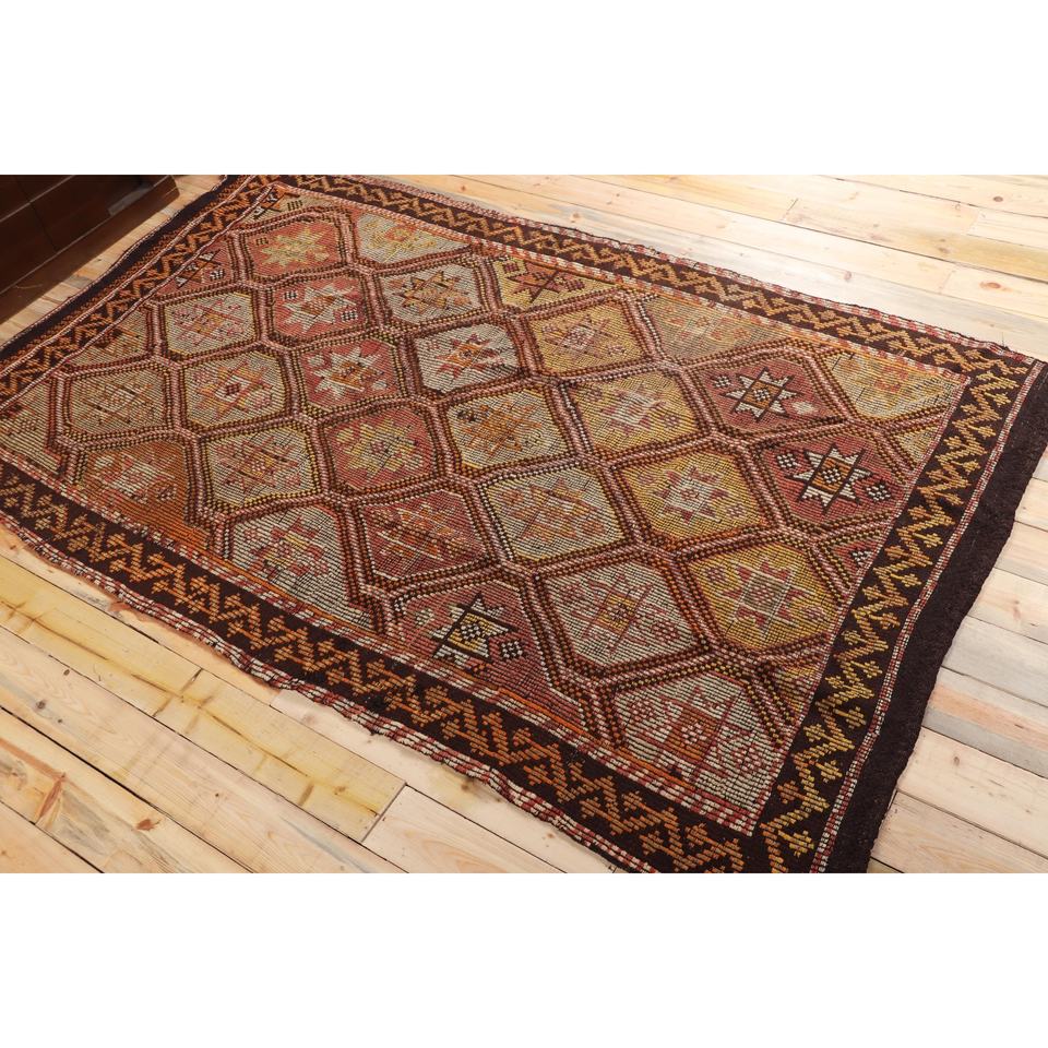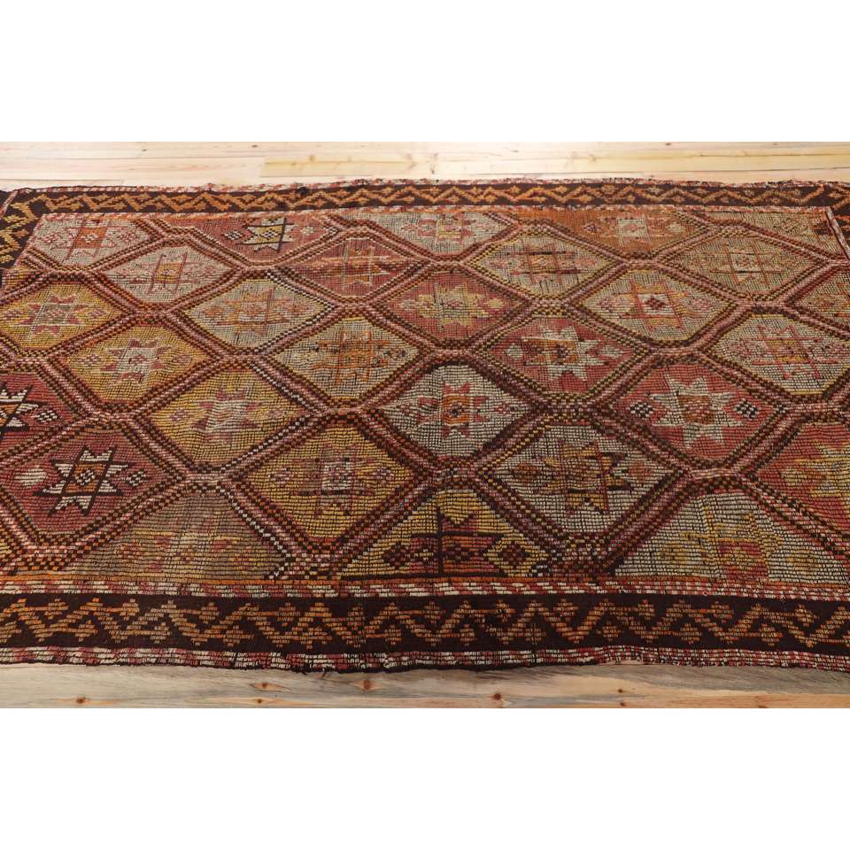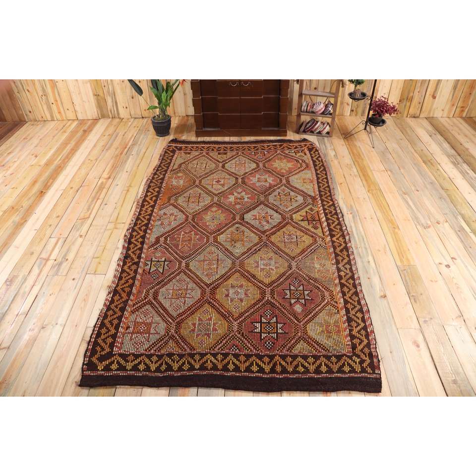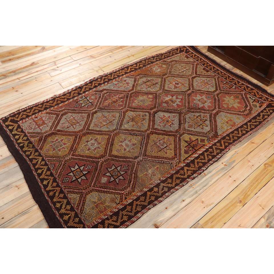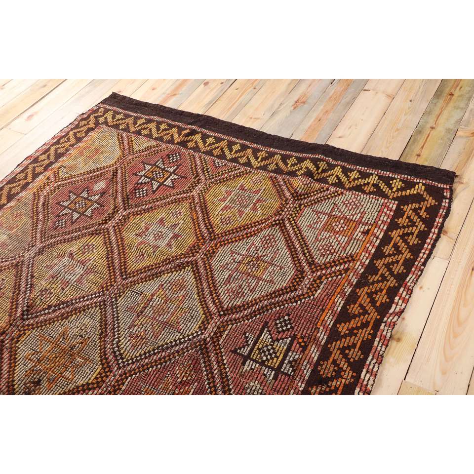 Alfombra Turca Vintage Grande de 5,3x9,1 pies (162x277 cm), Alfombra Kilim a Cuadros Marrón