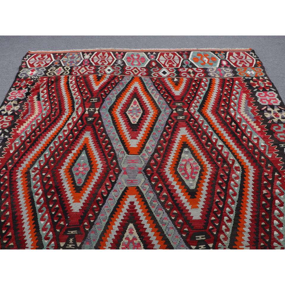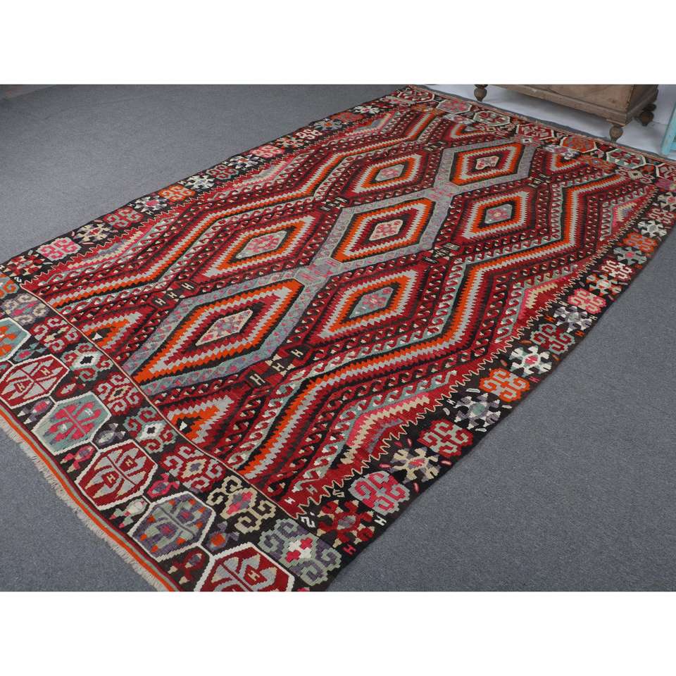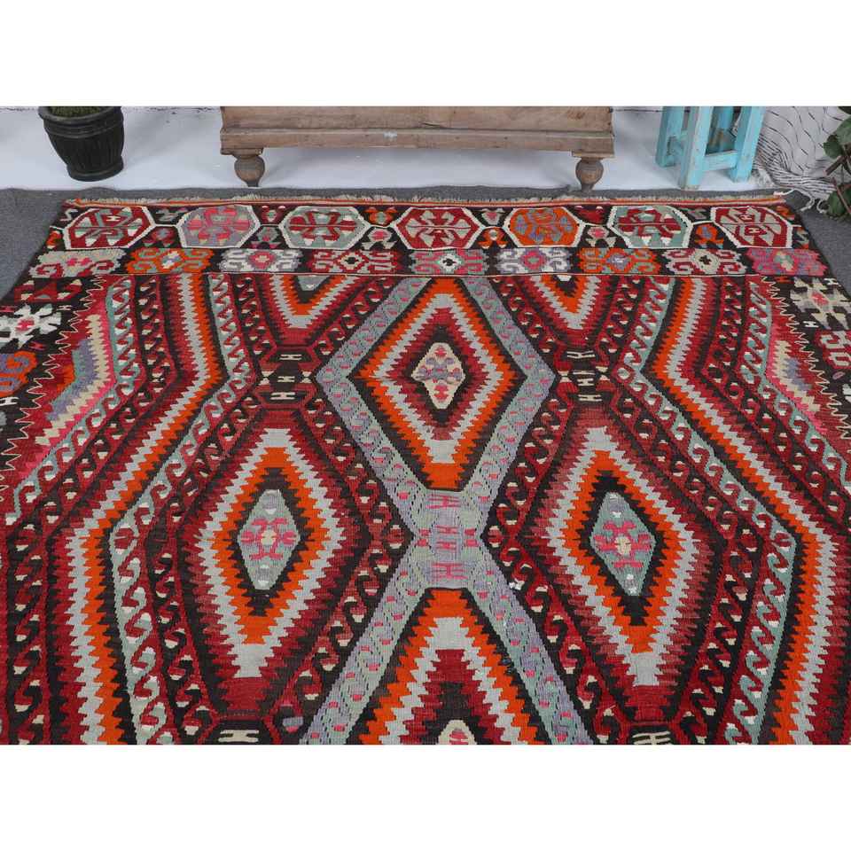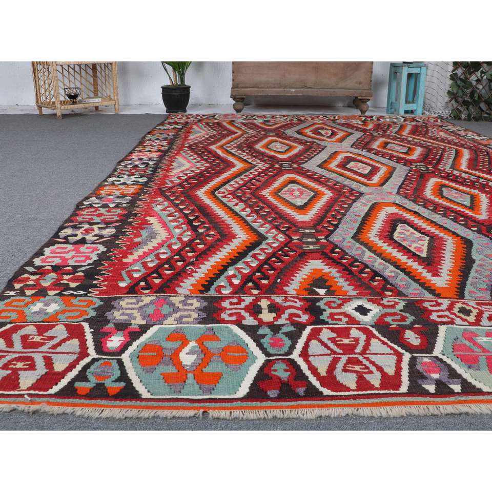 Alfombra Turca Vintage Grande de 6.4x10.7 pies, Alfombra de Lana a Rayas Roja y Naranja