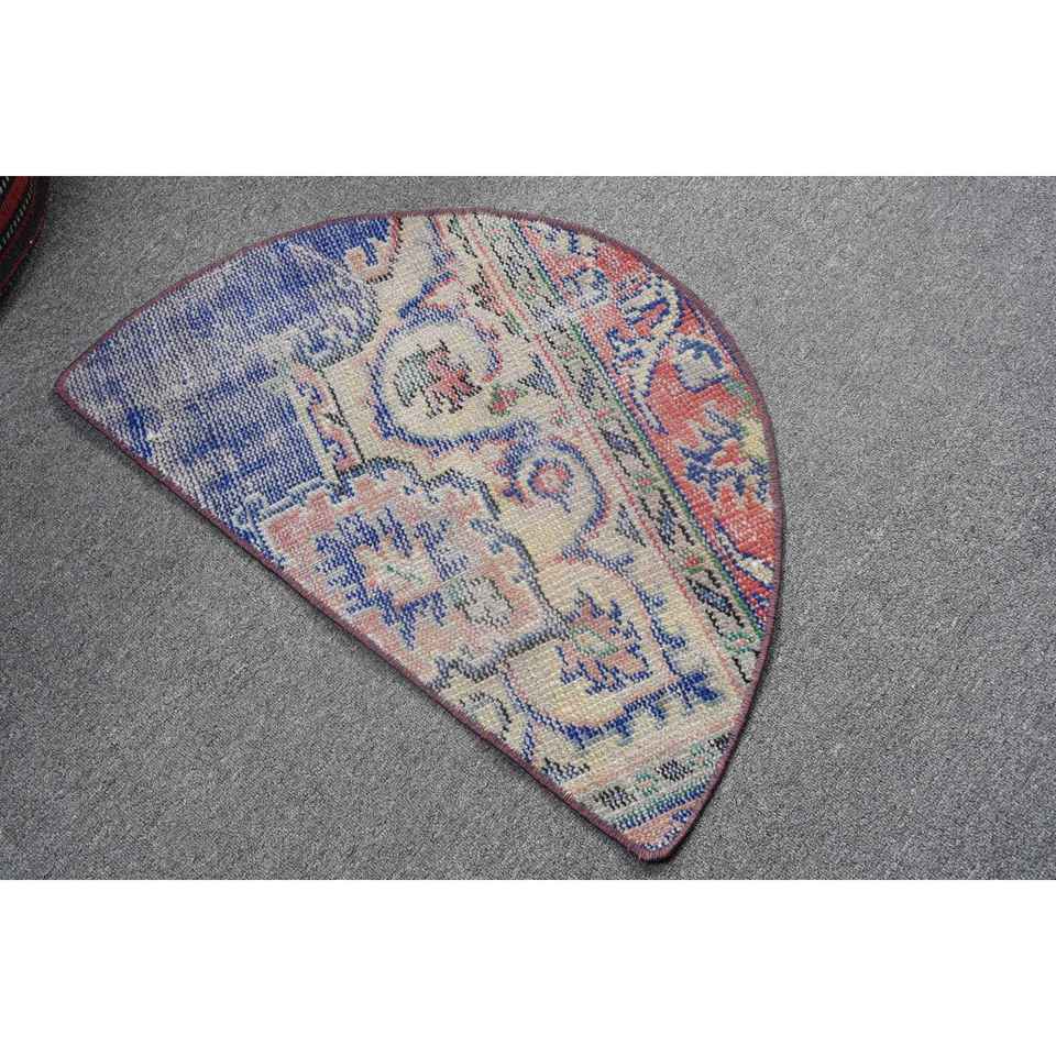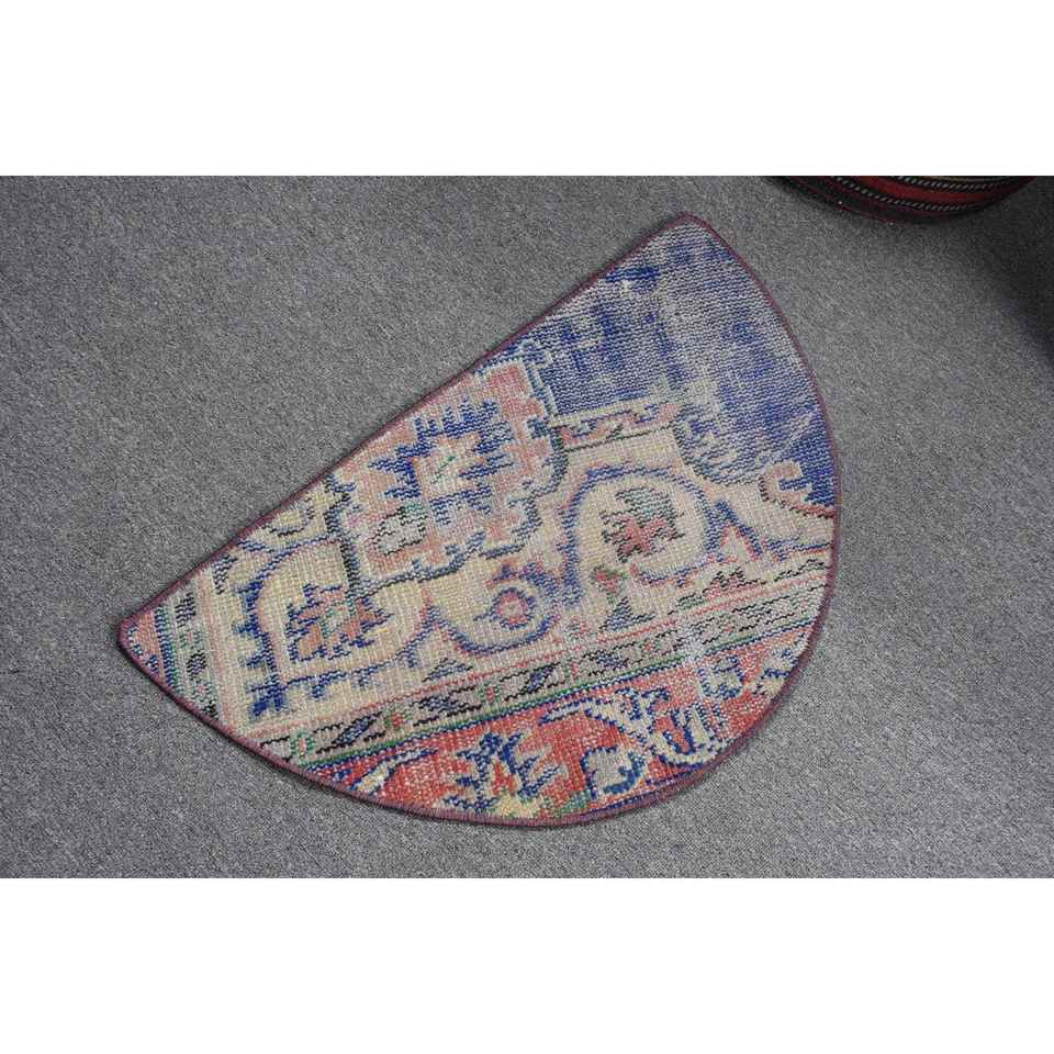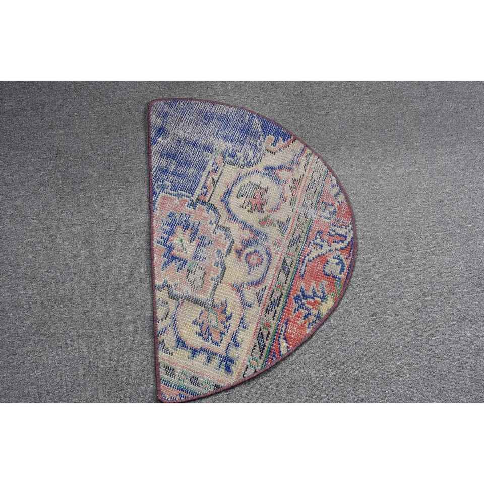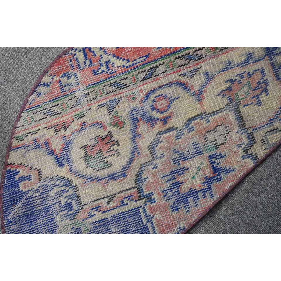 Alfombra Redonda Turca Vintage de 2.5x1.5 pies, Beige con Cuadros Azules, de Lana Ecológica con Base de Látex, Estilo Patchwork