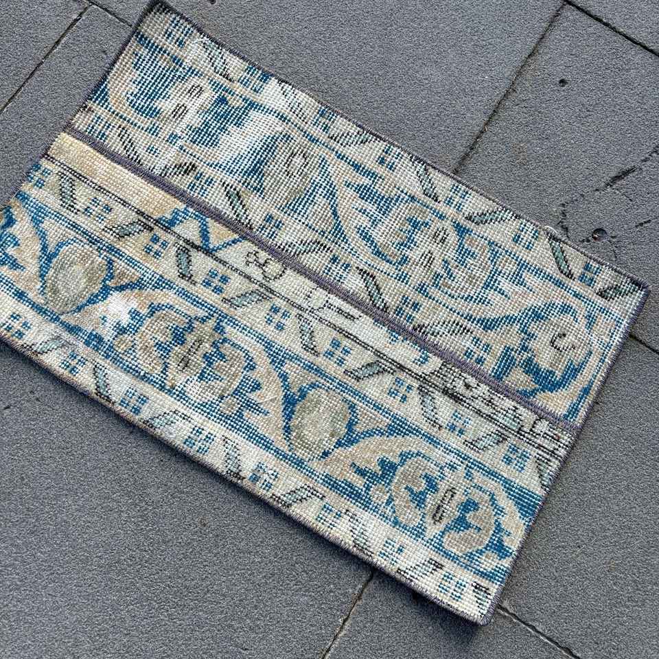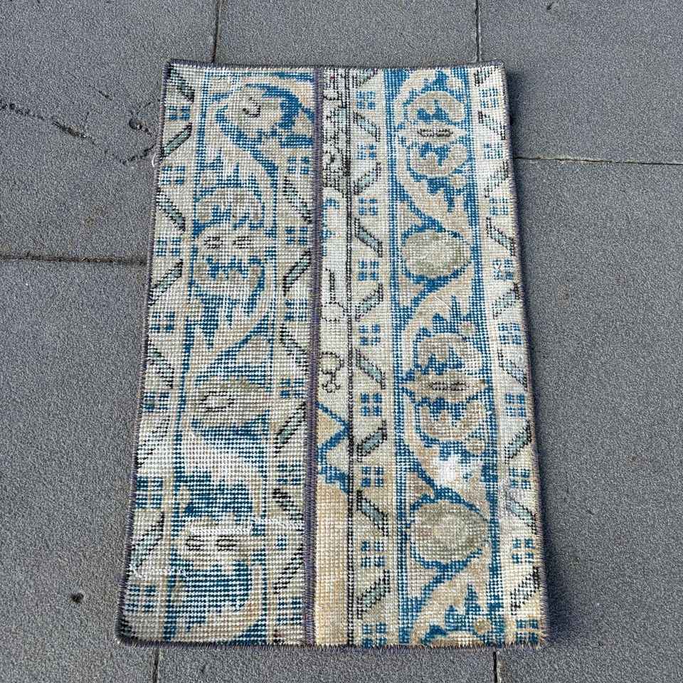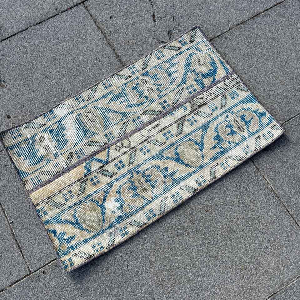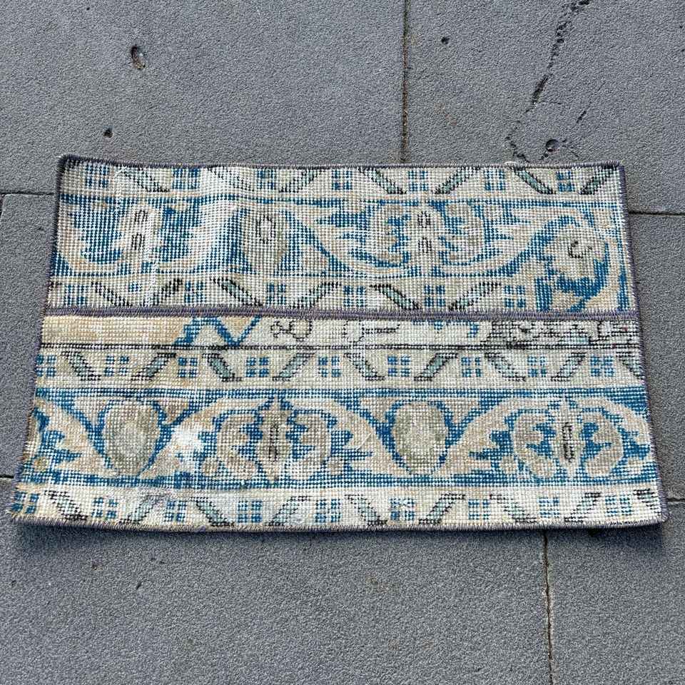 Alfombra Turca Vintage de 1.2x2 pies (38x60 cm), Alfombra de Lana Azul Abstracta