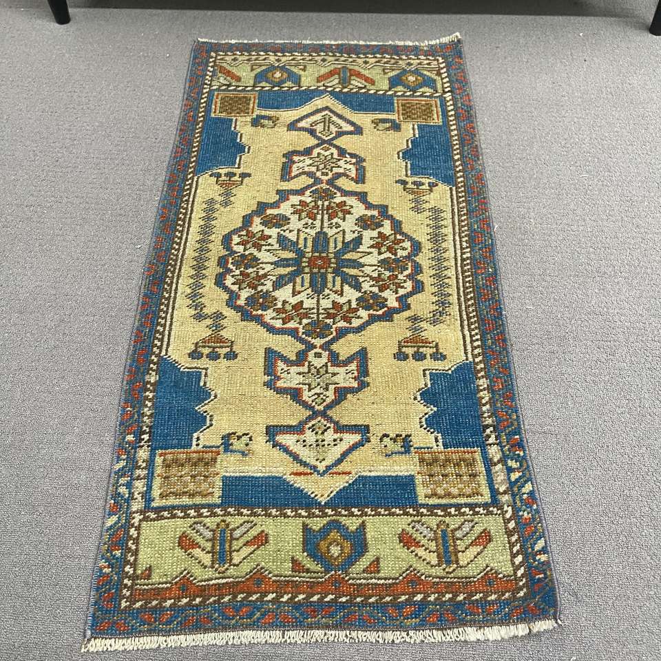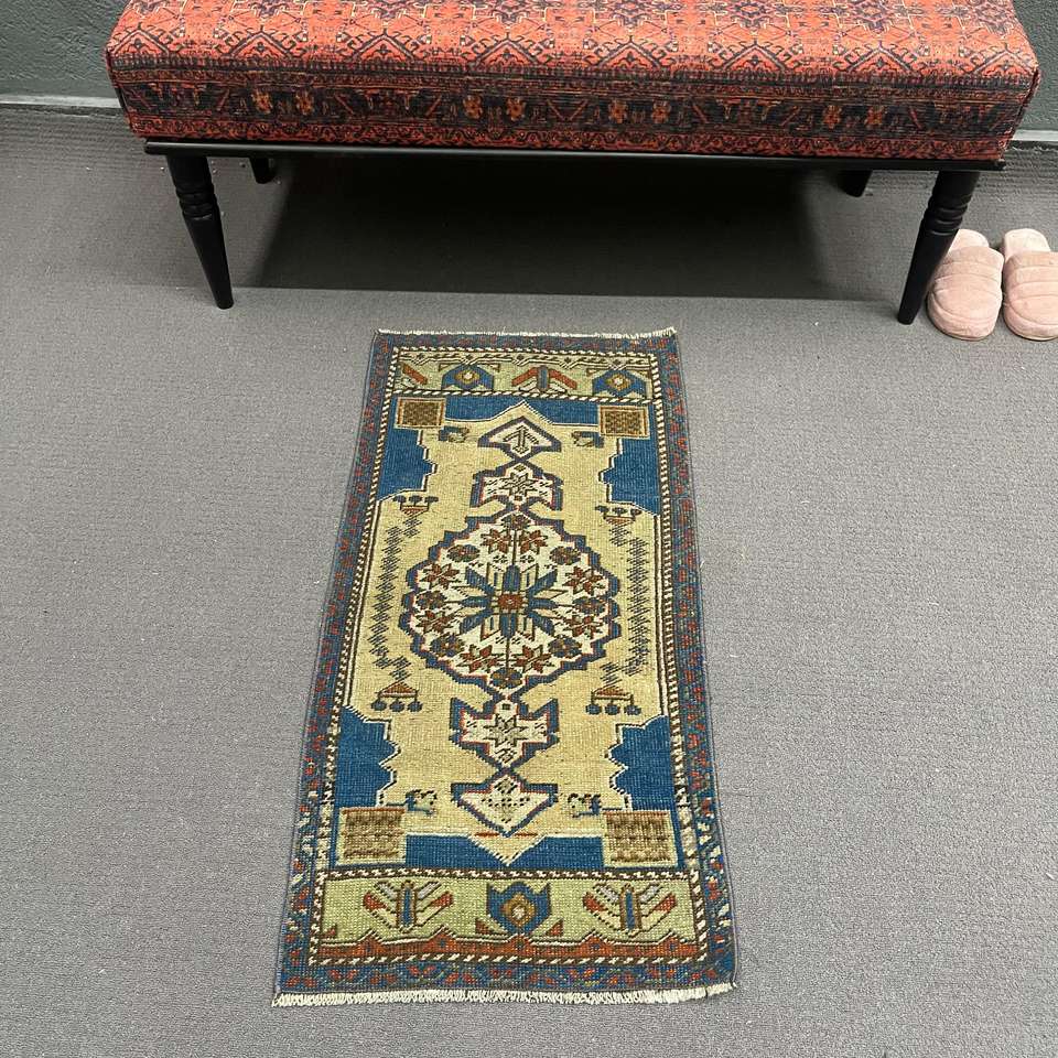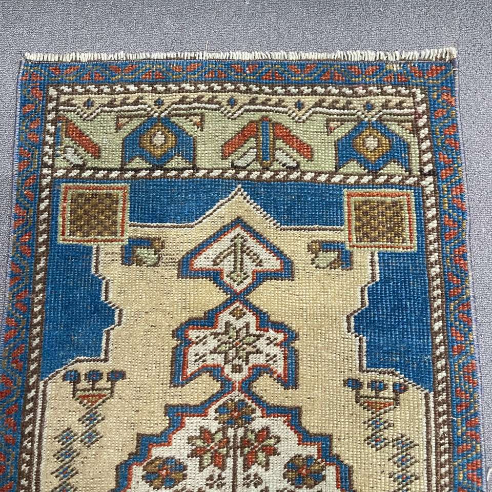 Alfombra Turca Vintage de 1.5x3.3 pies (47x100 cm), Alfombra Oriental Azul y Roja
