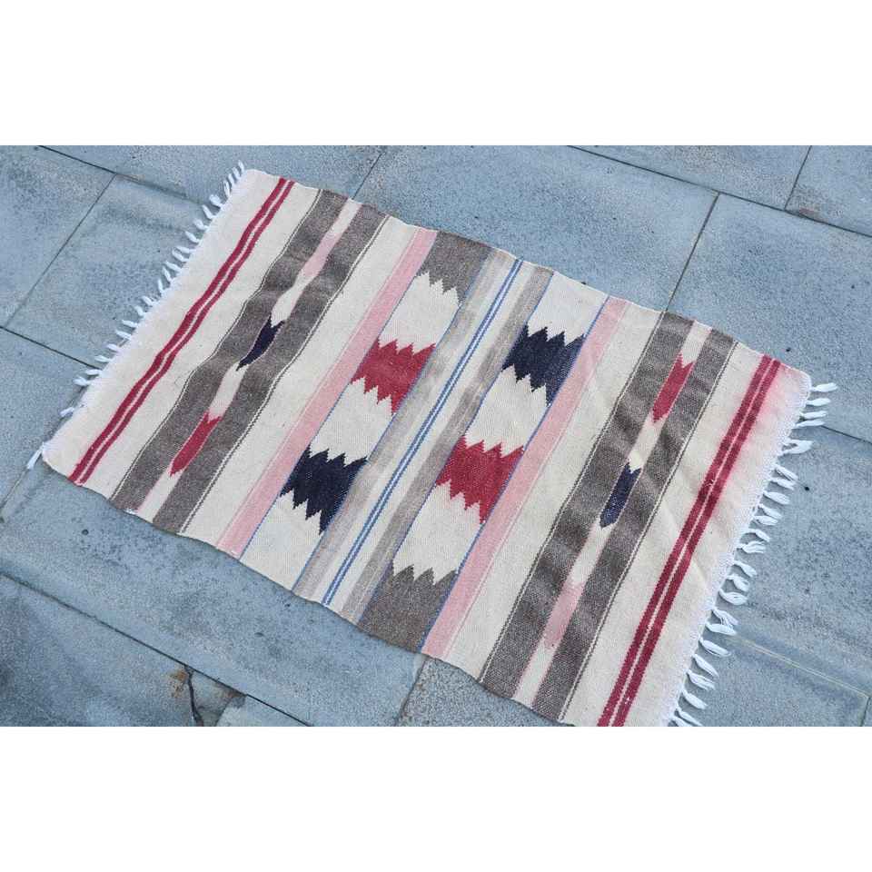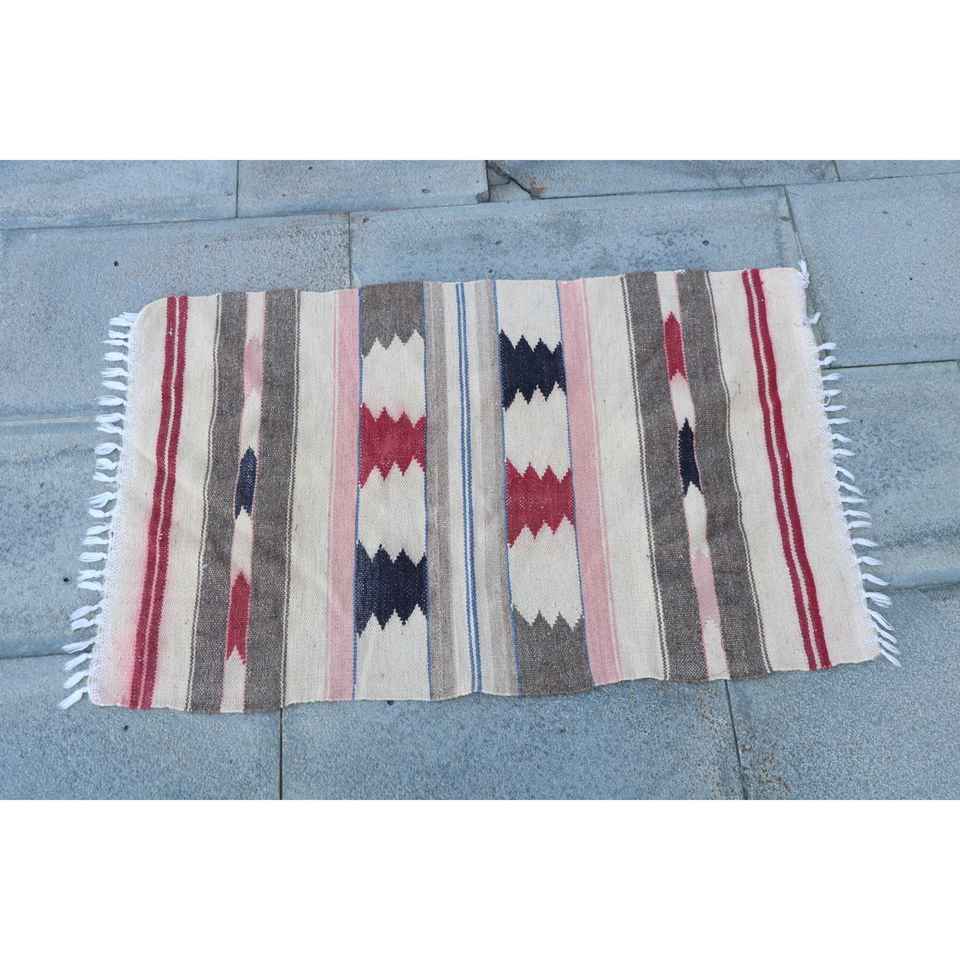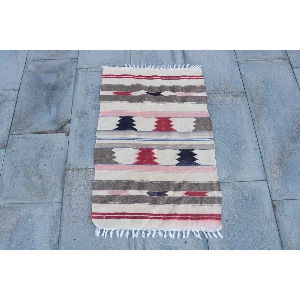 Alfombra Turca Vintage, Alfombra Pequeña de 1.8x2.9 pies, Alfombra de Lana con Diseño de Parches Rojos y Azules