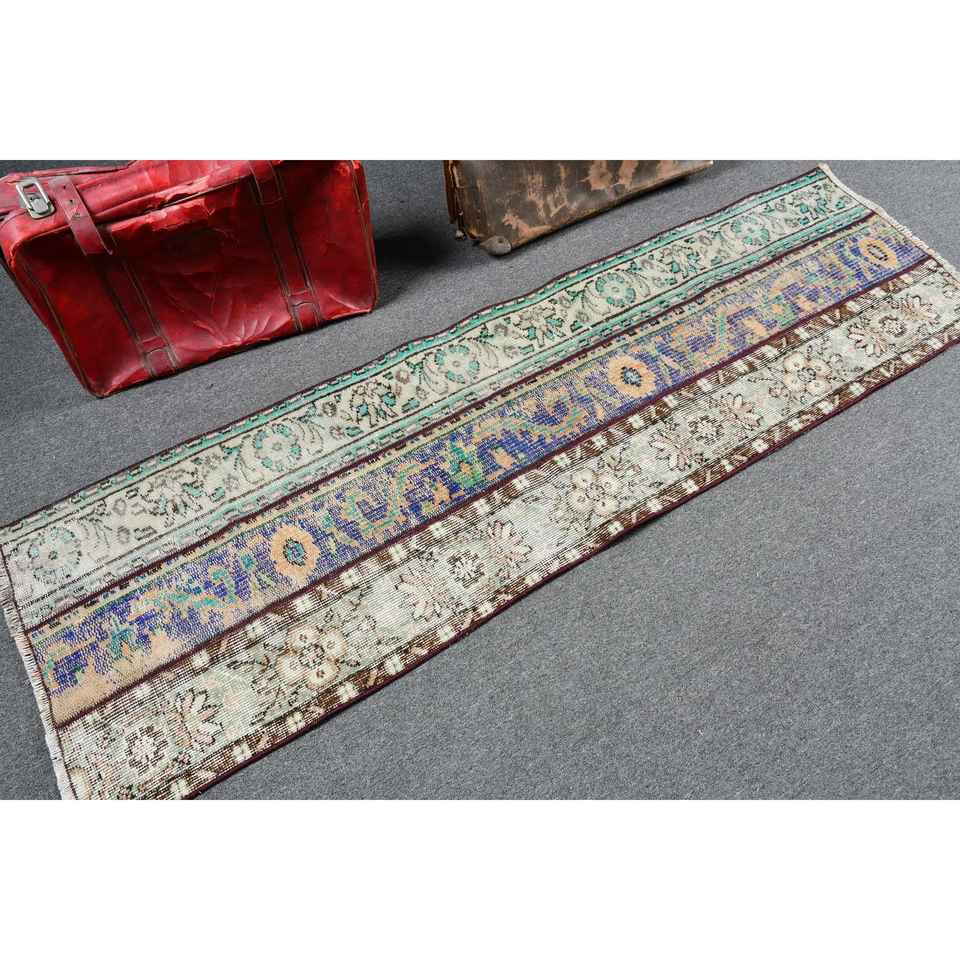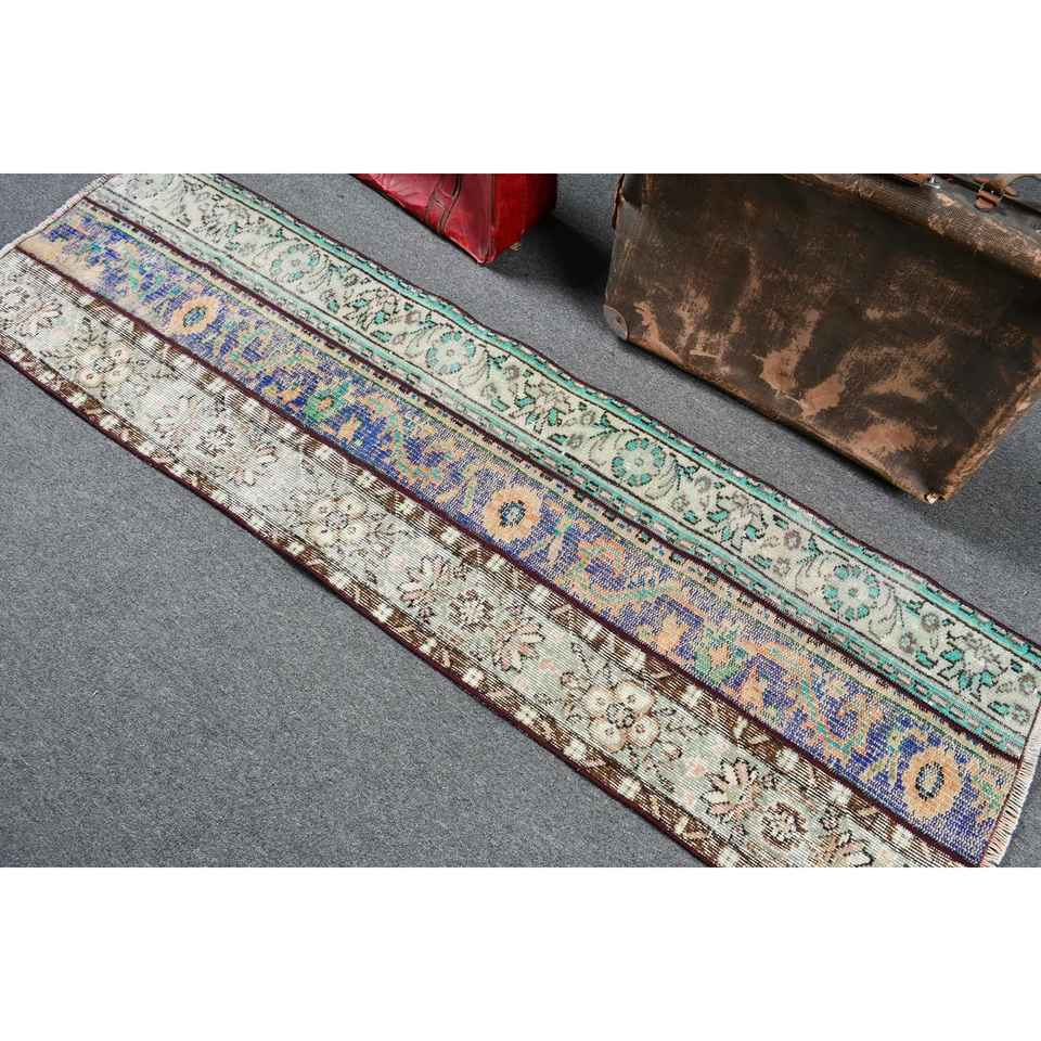 Alfombra Turca Vintage, Alfombra de Pasillo de 2.1x7 pies, Alfombra de Lana con Estampado Animal Azul Marrón