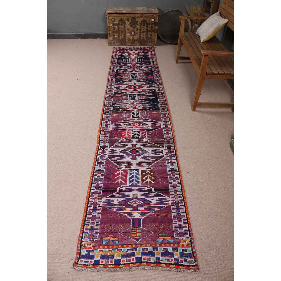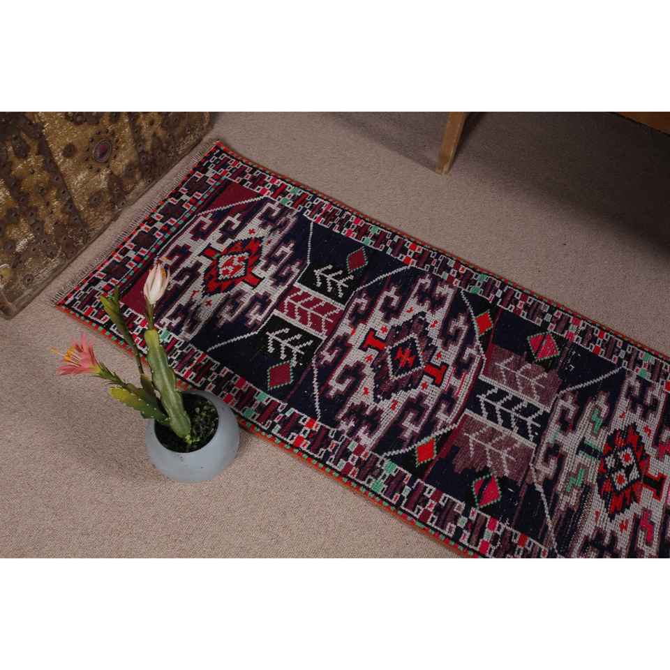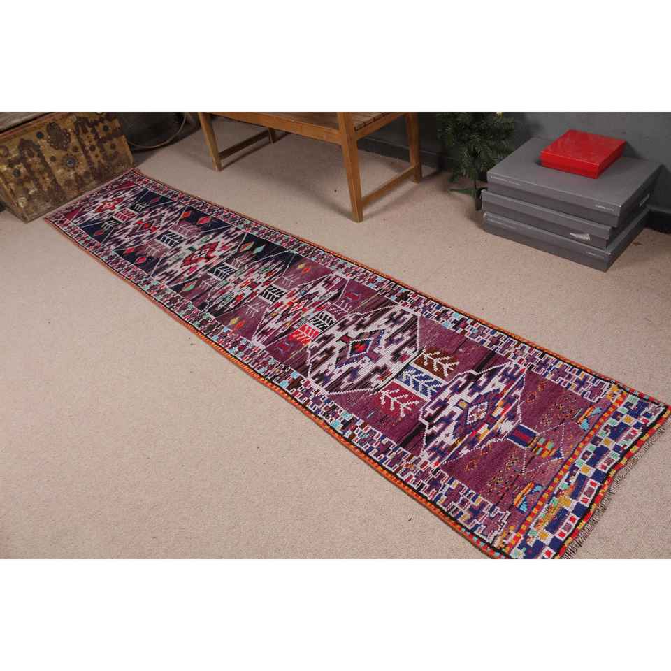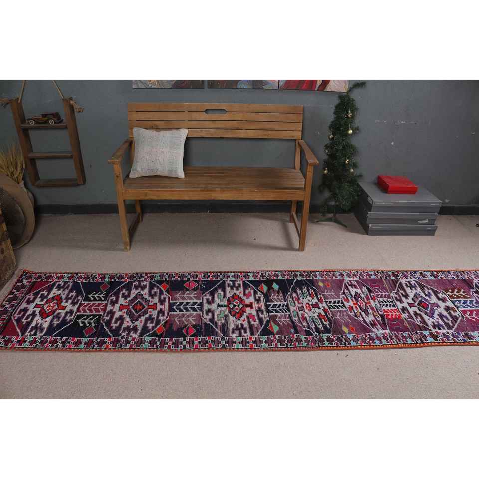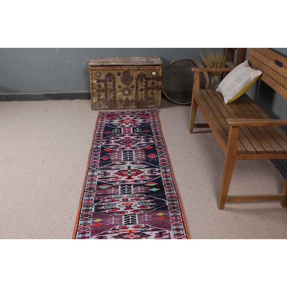 Alfombra Turca Vintage, Alfombra de Pasillo de 2.2x10.8 pies, Alfombra de Lana con Estampado Animal en Tonos Púrpura y Azul