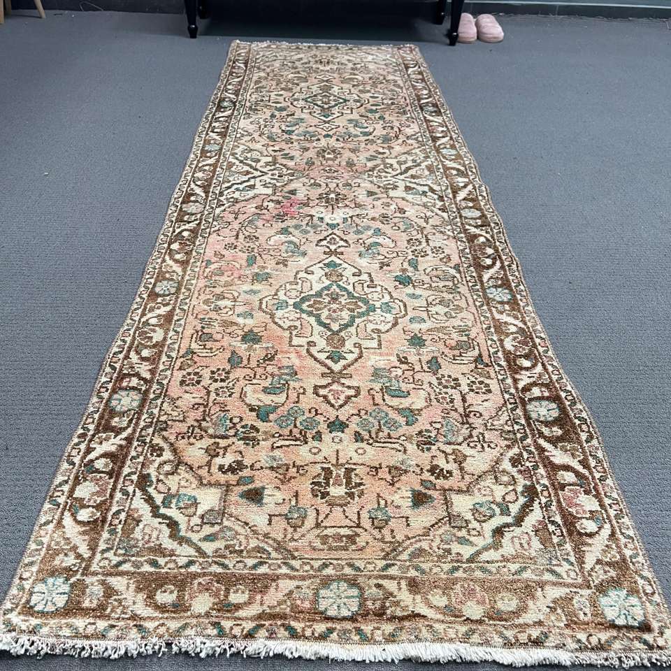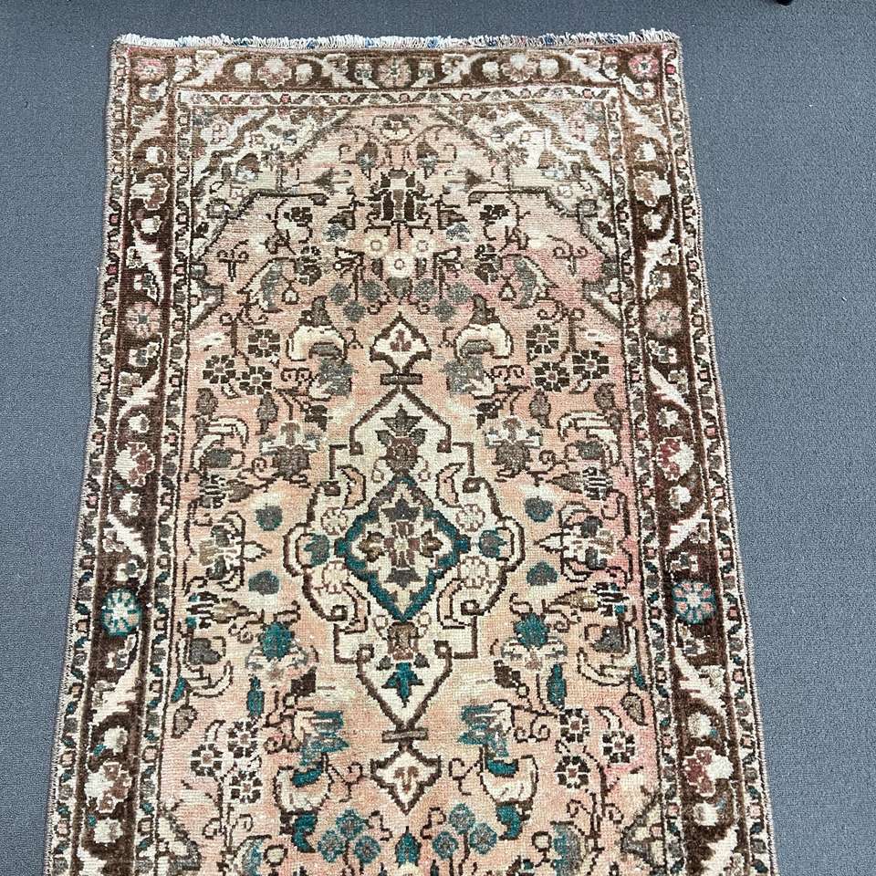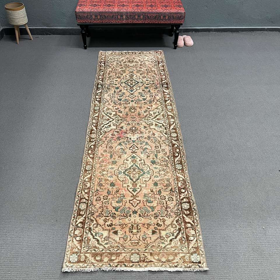 Alfombra Turca Vintage, Alfombra de Pasillo de 2.6x8.4 pies, Alfombra Oriental de Lana Marrón y Azul