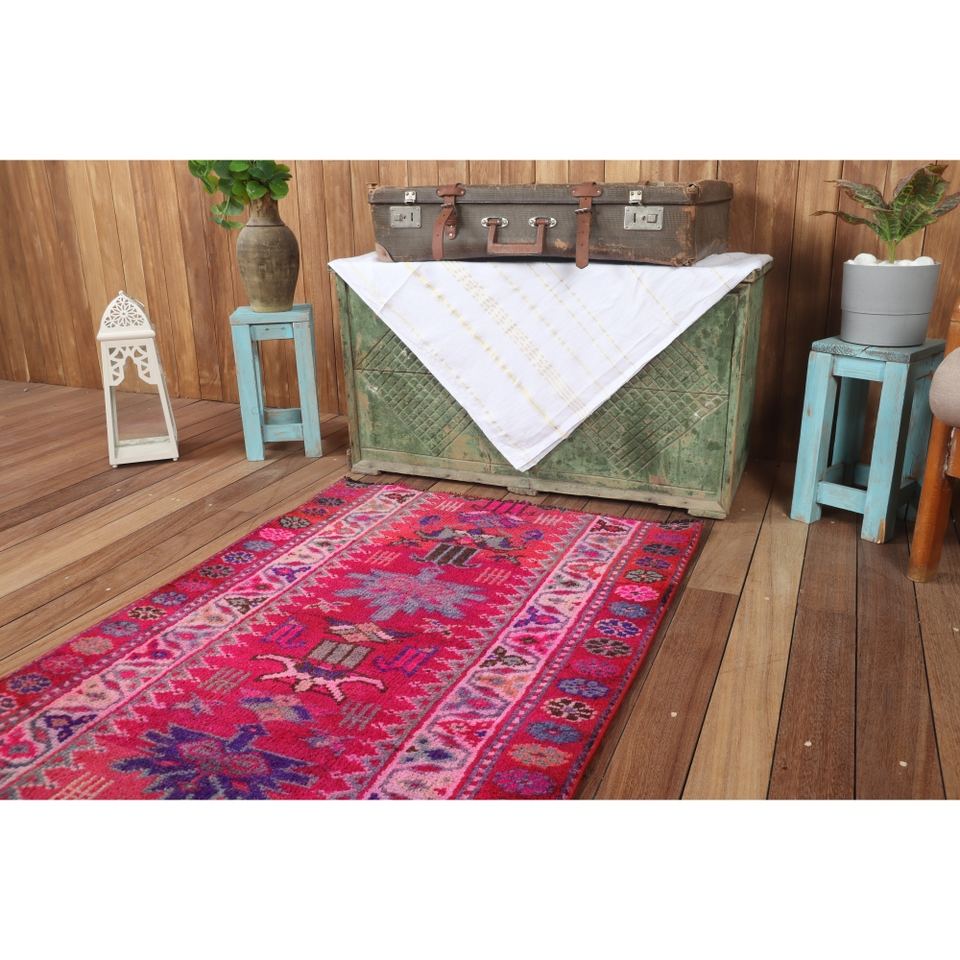 Alfombra Turca Vintage de 2.7x4.2 pies (83x127 cm), Herki Rosa Púrpura Geométrica con elementos florales