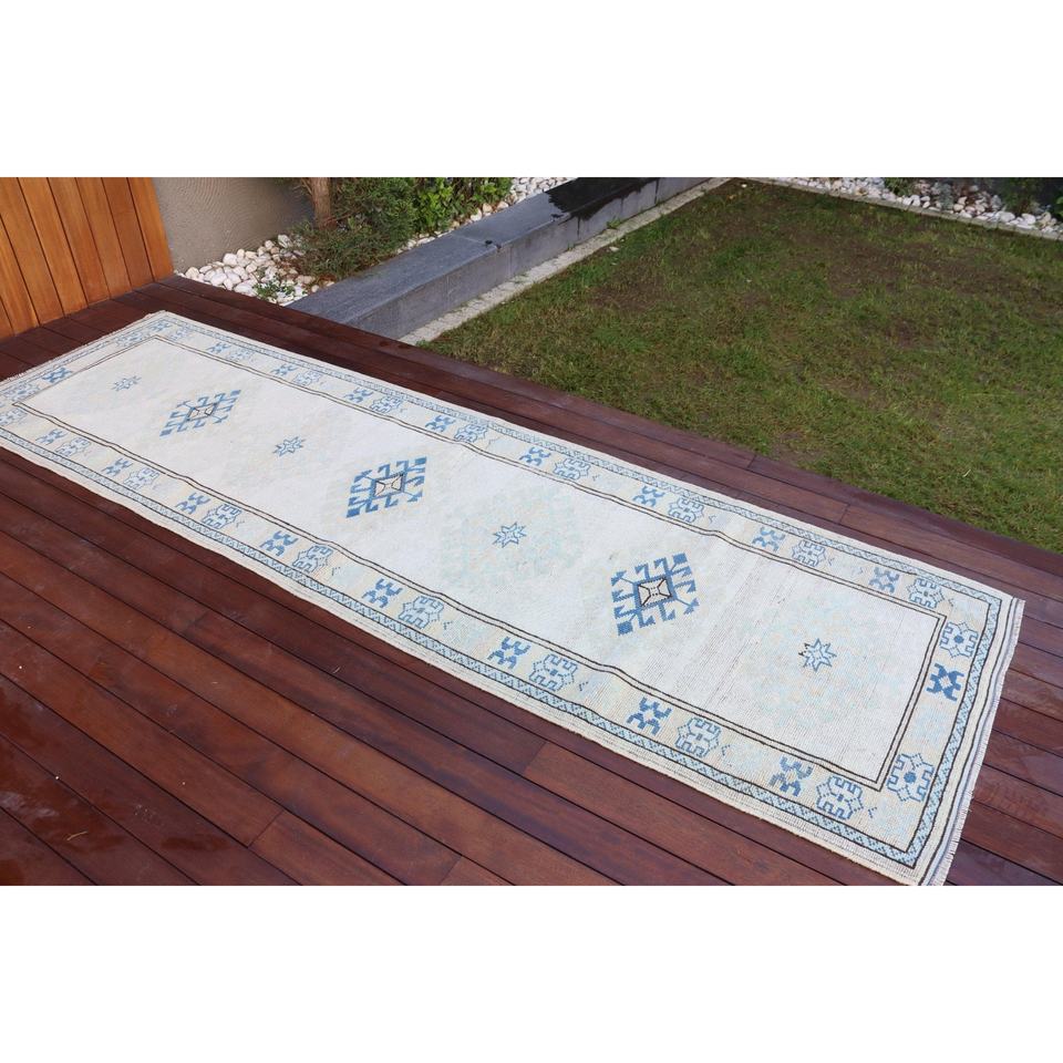 Alfombra Turca Vintage de 2.8x9.3 pies (84x282 cm), Alfombra a Rayas Azules y Blancas