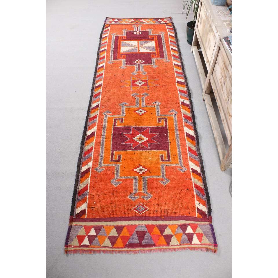 Alfombra Turca Vintage, Alfombra de Pasillo de 3.1x9.7 pies, Alfombra Floral Herki Naranja