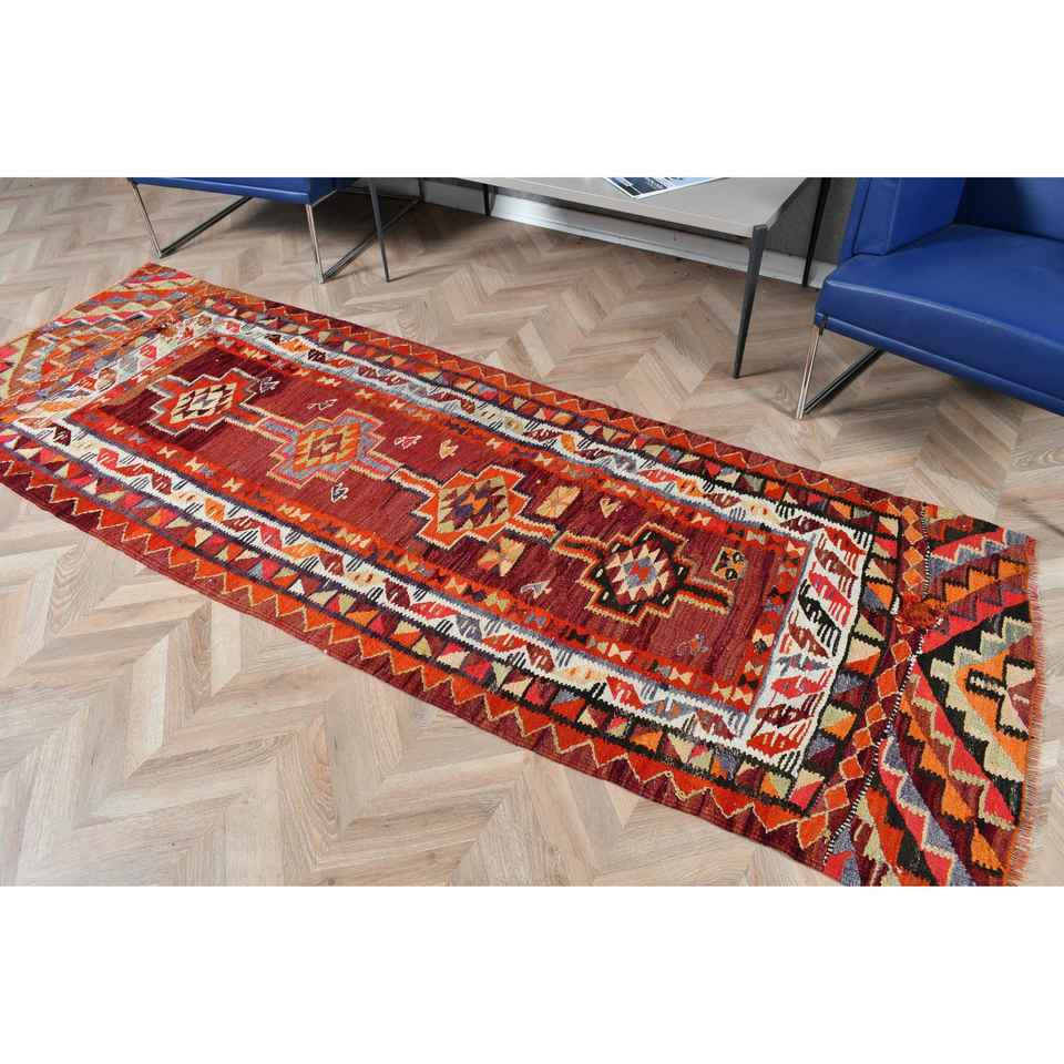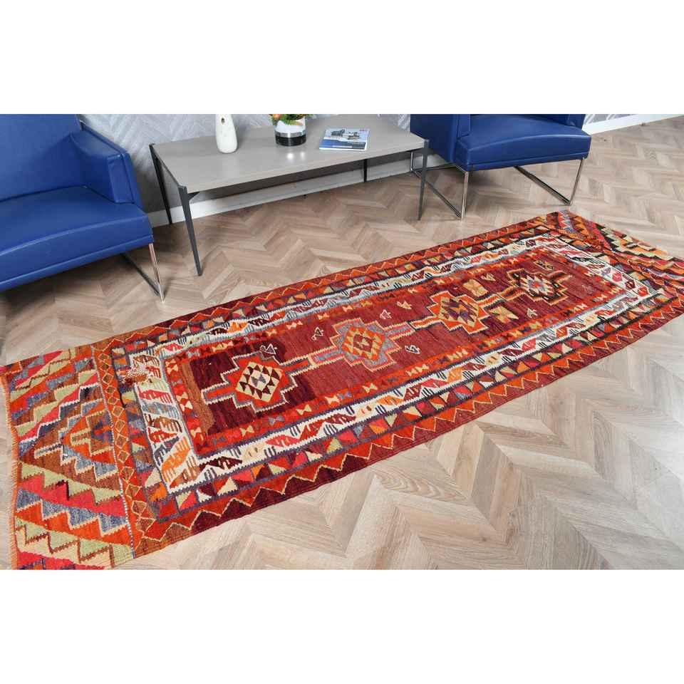 Alfombra Turca Vintage de Lana 3.2x9.2 pies (97x281 cm) con Respaldo de Látex Ecológico, Kilim Rojo Naranja con Diseño de Patchwork